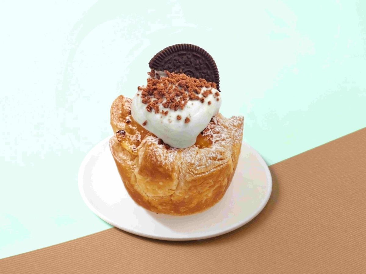 カップケーキのようなかわいい見た目のアップルパイ。ミント風味クリームとほろ苦いココアビスケットがのることで、チョコミントフェアらしさ満載に。ごろっとしたりんごとスーッと爽快なチョコミントの、意外にもよい組み合わせを味わってみて!