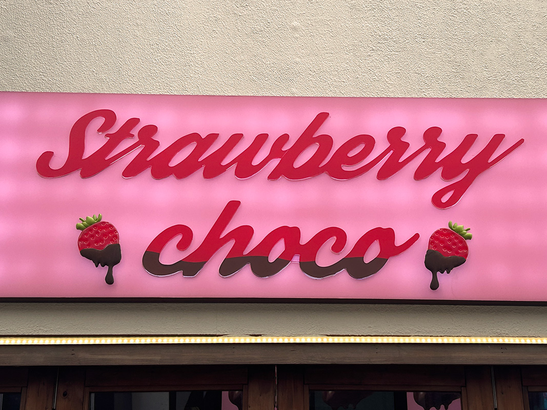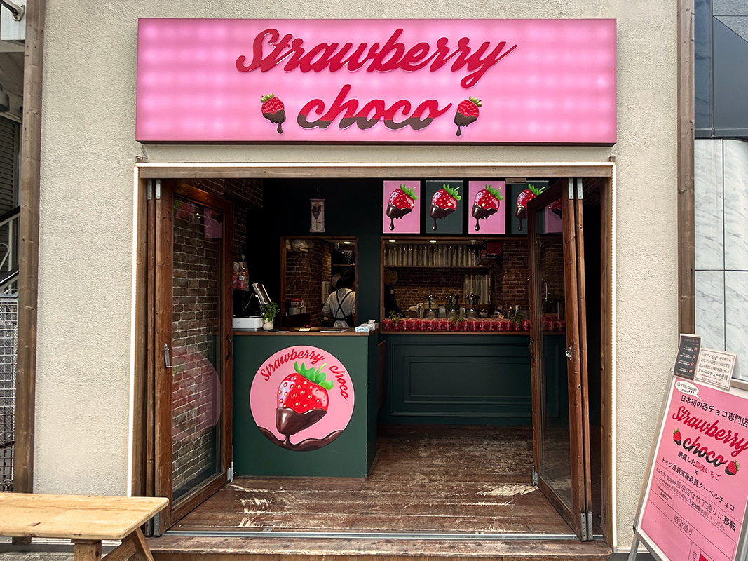 JR原宿駅から6分ほど歩くと、ポップな看板がかわいい「Strawberry choco 原宿店」が見えてきます。