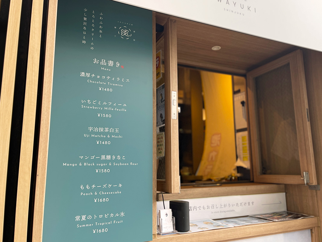 ここで味わえるフレーバーは「濃厚チョコティラミス」1480円、「いちごミルフィーユ」1580円、「宇治抹茶白玉」1480円、「マンゴー黒蜜きなこ」1580円、「ももチーズケーキ」1680円、「常夏のトロピカル氷」1680円の全6種。(※取材時2024年6月時点)