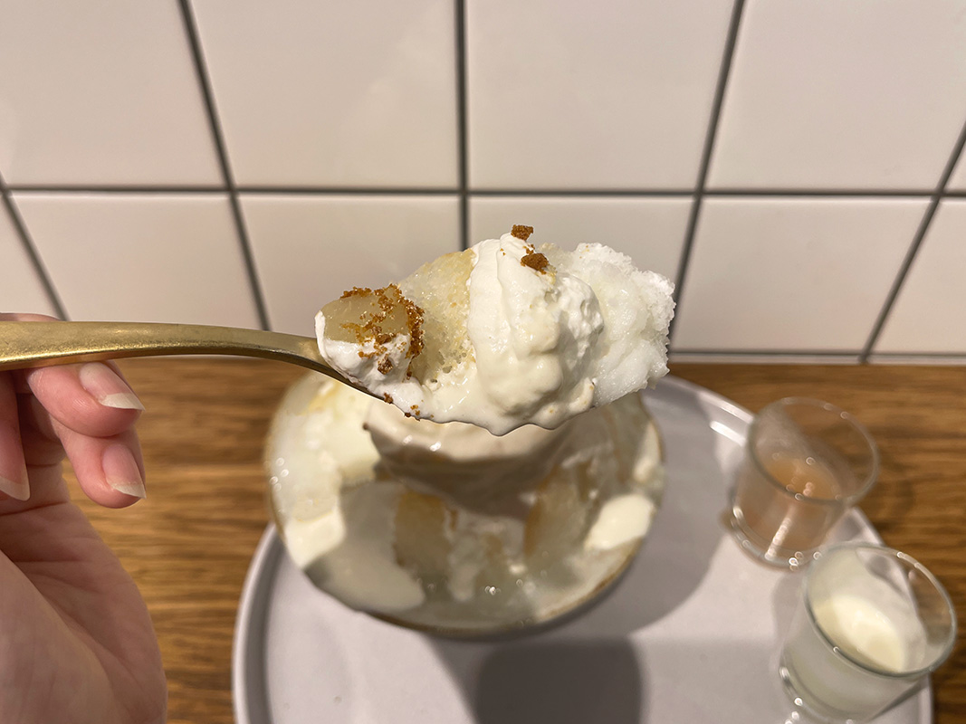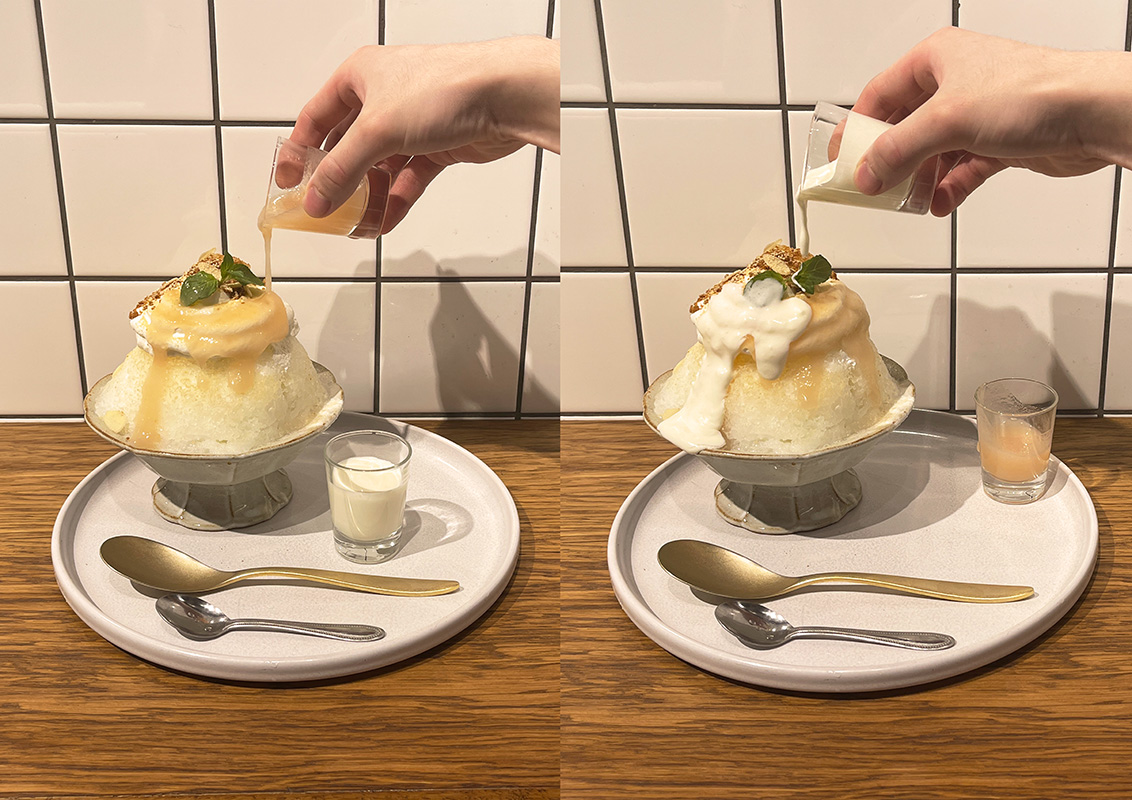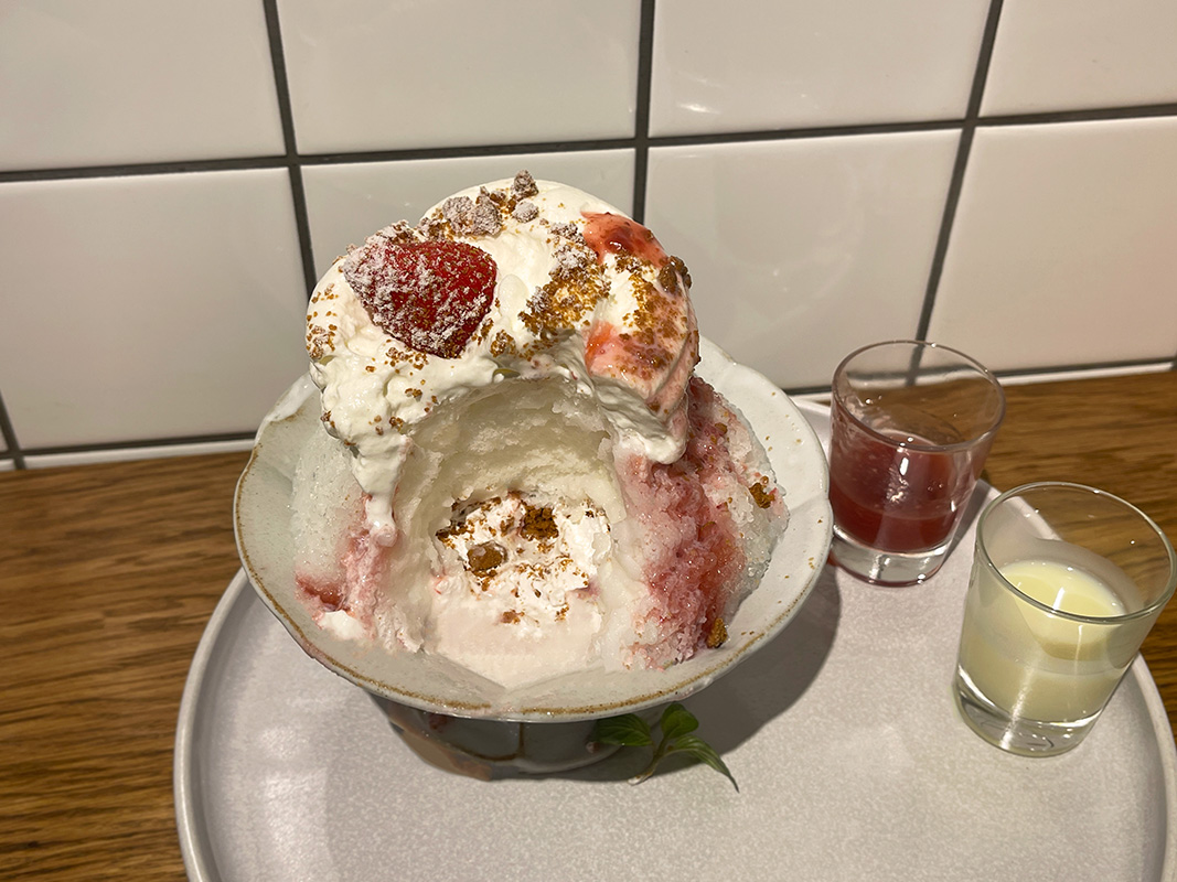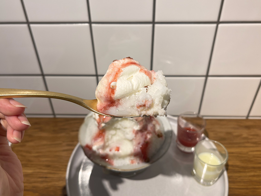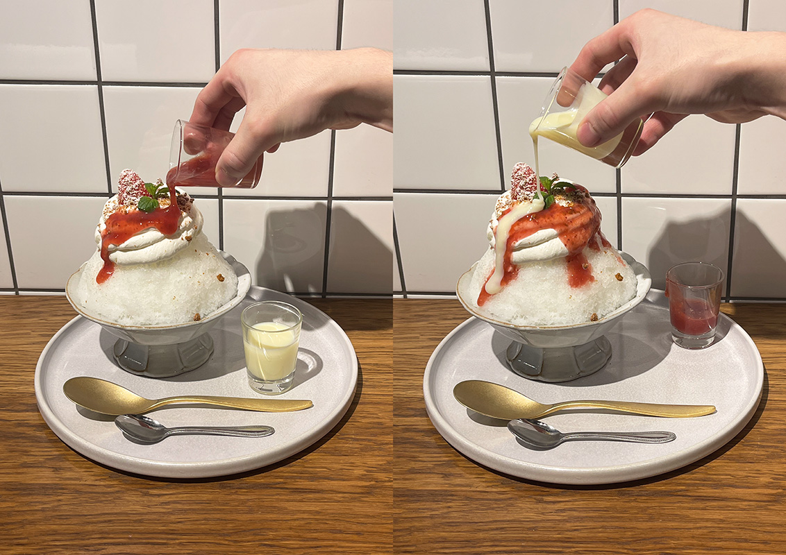 かき氷の横に添えられているイチゴのソース&練乳は、自分でかけるスタイル。最後の仕上げを自分で行う体験型なのもテンションが上がりますね。