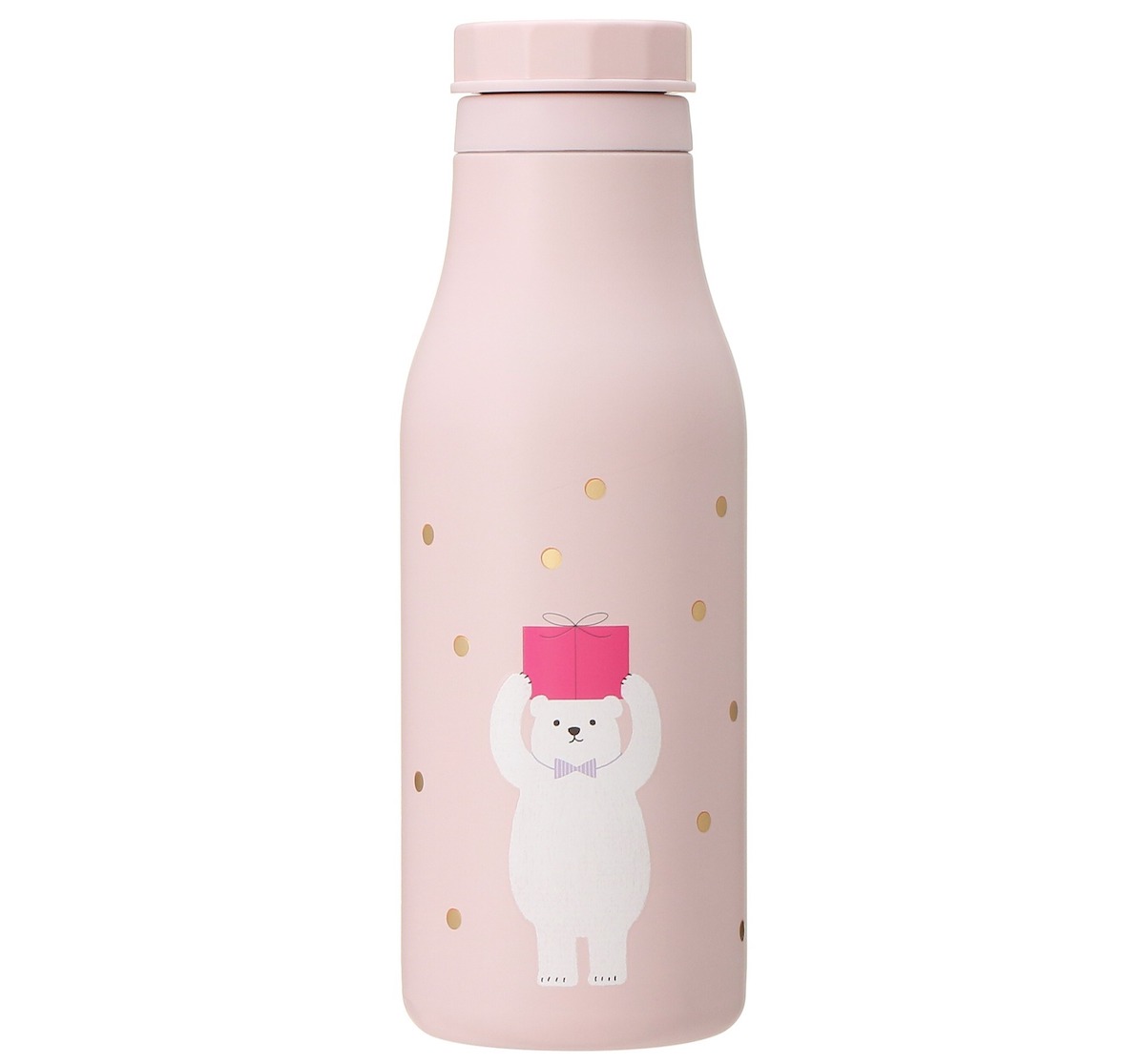おめかしをしたポーラーベアが、プレゼントをお届けする様子をかわいらしく描いたステンレスボトル。雪のように舞うゴールドのプリントがアクセントに。ふんわりとした淡いピンクのカラーがポーラーベアの愛らしい姿とともに癒やしを与えてくれそう♪