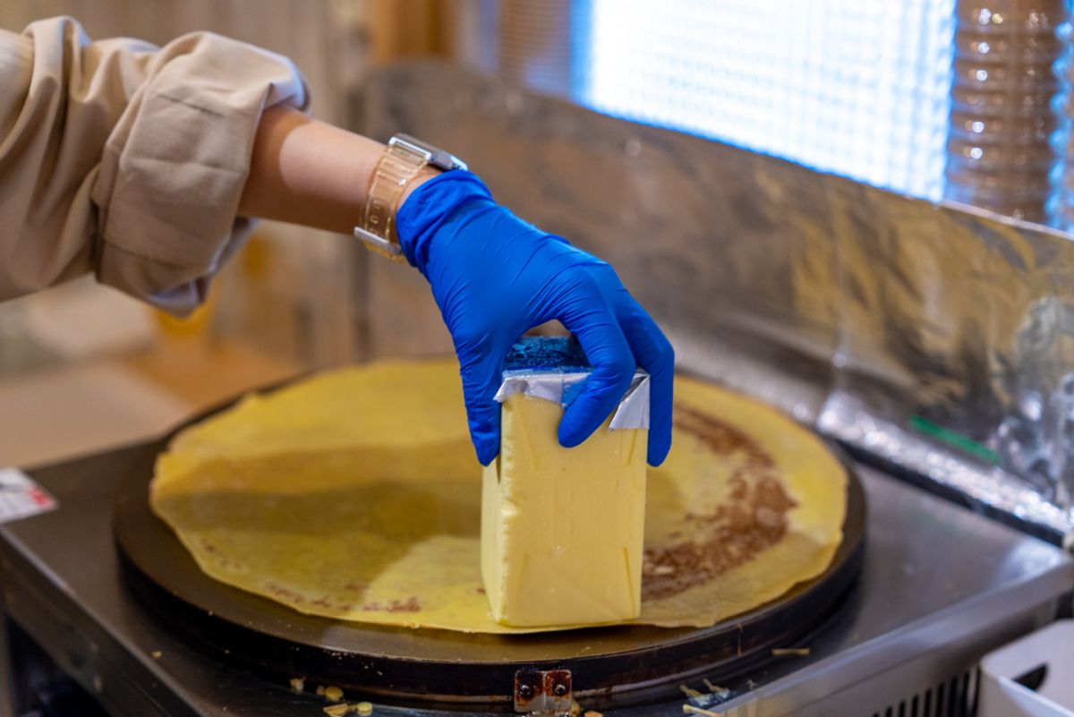 極薄で焼き上げるクレープは、食べ始めはパリッと、食べ進めていくと生地のもちもち感が味わえるように食感の変化について試行錯誤を重ねたそう。オーダーを受けてからじっくり焼き上げるので、どうしても時間がかかってしまいますが、待った分おいしさもひとしおです。会計後は、お店の付近で待つか、焼き上がりの目安の時間を教えてくれるので、その時間帯までにお店に戻ってくればOK。待ち時間に元町ショッピングストリートでお買い物をするなど、有効に時間を使うこともできます。