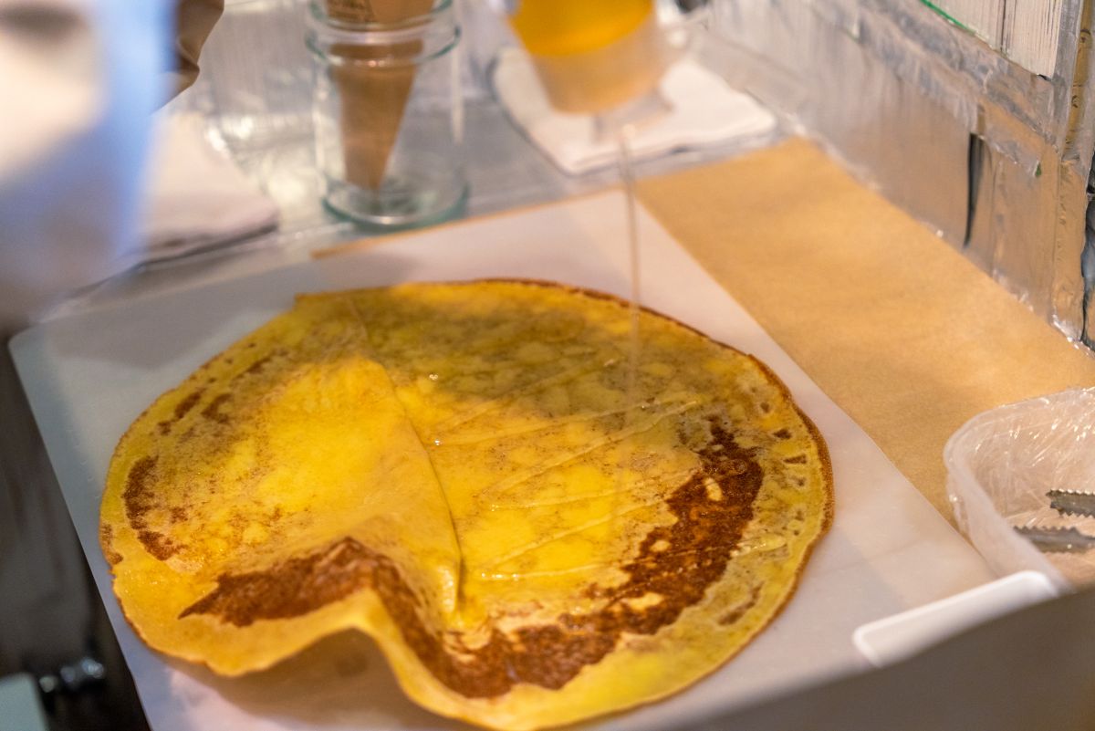 くるりと巻いて中にエスプーマ仕立ての軽やかなシャンティクリームを入れたら、さらに生ハチミツをたっぷりかけて完成! 軽やかで甘さのないクリームと、生ハチミツのフレッシュながら濃厚な甘さ、熱々でパリッとした生地が三位一体となり、口の中であっという間に溶けていきます。ボリュームもしっかりあるので、食べごたえも抜群ですよ。