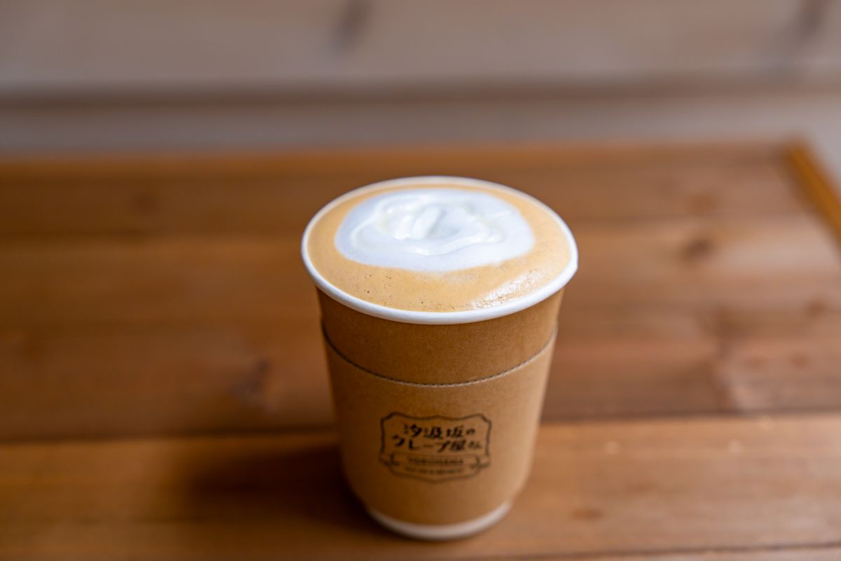 「汐汲坂のクレープ屋さん」のドリンクメニューは、生ハチミツを使用した「ハニーラテ」680円がおすすめ。横浜のコーヒーショップ、「キャラバンコーヒー」のコーヒー豆を使用し、コクのある苦味と生ハチミツの甘さのバランスが絶妙な一杯です。