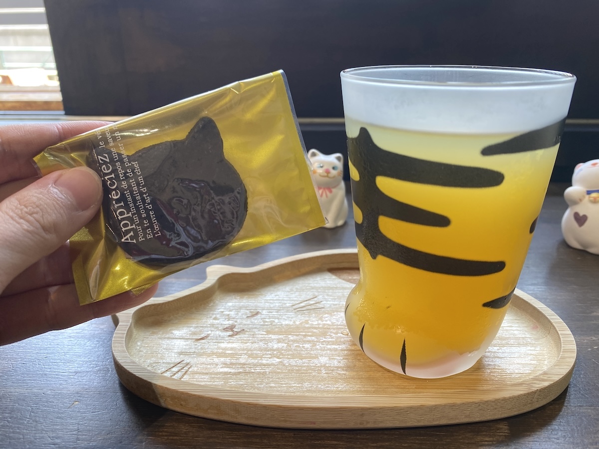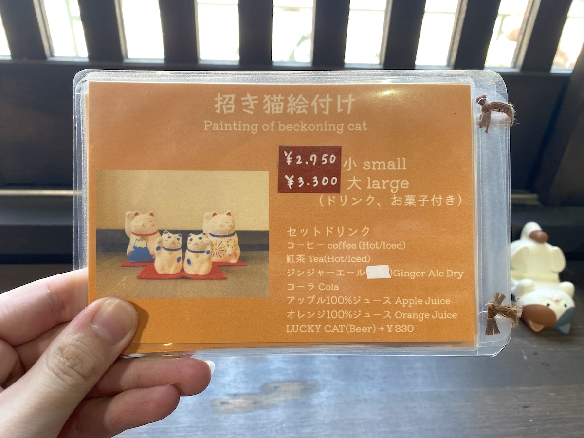 所要時間はおよそ1時間。料金は選ぶ招き猫のサイズで異なり、「小サイズ」2750円、「大サイズ」3300円です。体験には、お菓子とドリンクがセットになっていて、お菓子はクッキーやマドレーヌなどからランダムで提供。ドリンクはコーヒーや紅茶、オレンジジュースなど6種類のなかからセレクトできます。追加料金330円を支払えば、「ラッキーキャット」というかわいいネーミングのビールも選択可能です。