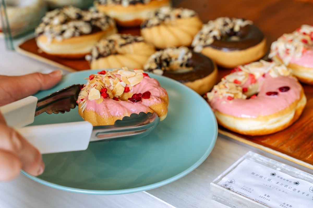 米粉と玄米粉は伏見・向島の宮本ファームから直送されたものを使用するほか、イーストドーナツの揚げ油は米油を用いてさっくり食感をかなえるなど、“いいもの”をとことん選りすぐって提供。「ドーナツはカロリーが気になる…」「なるべくギトギト感のないドーナツが食べたい…」という方も、あまり罪悪感なく手に取れますね♪