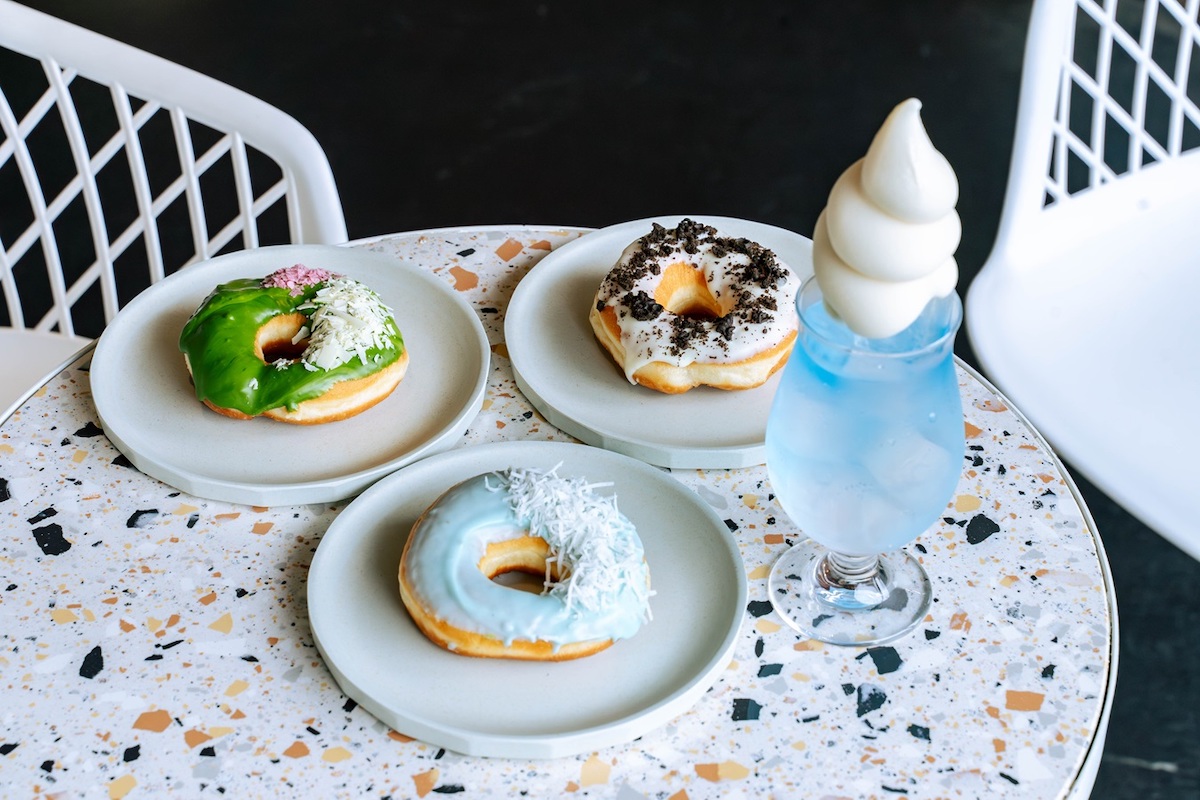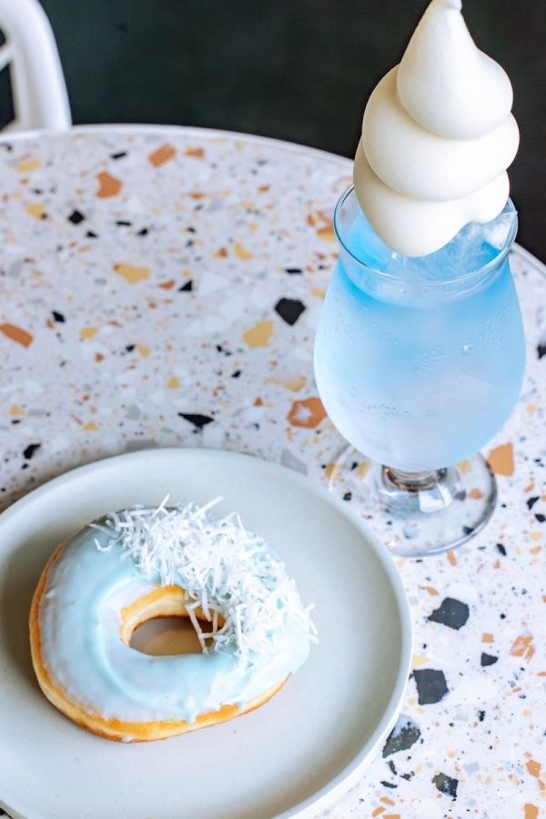 コーヒーや紅茶のほか、塩ラテやほうじ茶ティーラテなどドーナツと一緒に飲みたいドリンクメニューも勢揃い。ミルク感たっぷりのソフトクリームをたっぷりトッピングした「クリームソーダ青」は、もちろんスピルリナで色付けされたものです。