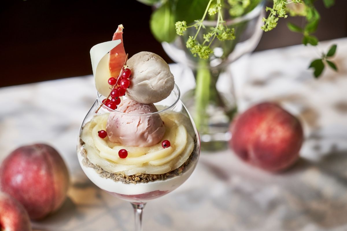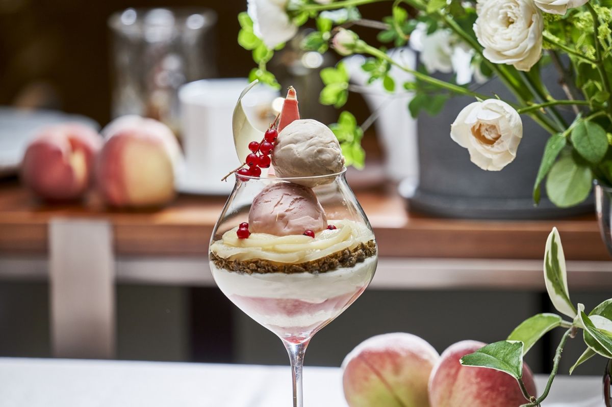 「あら川の桃パフェ」は、ホテルパティシエが「あら川の桃」をさまざまにアレンジした、桃と相性のよいアールグレーとの組み合わせがおいしい、この時季だけのパフェ。