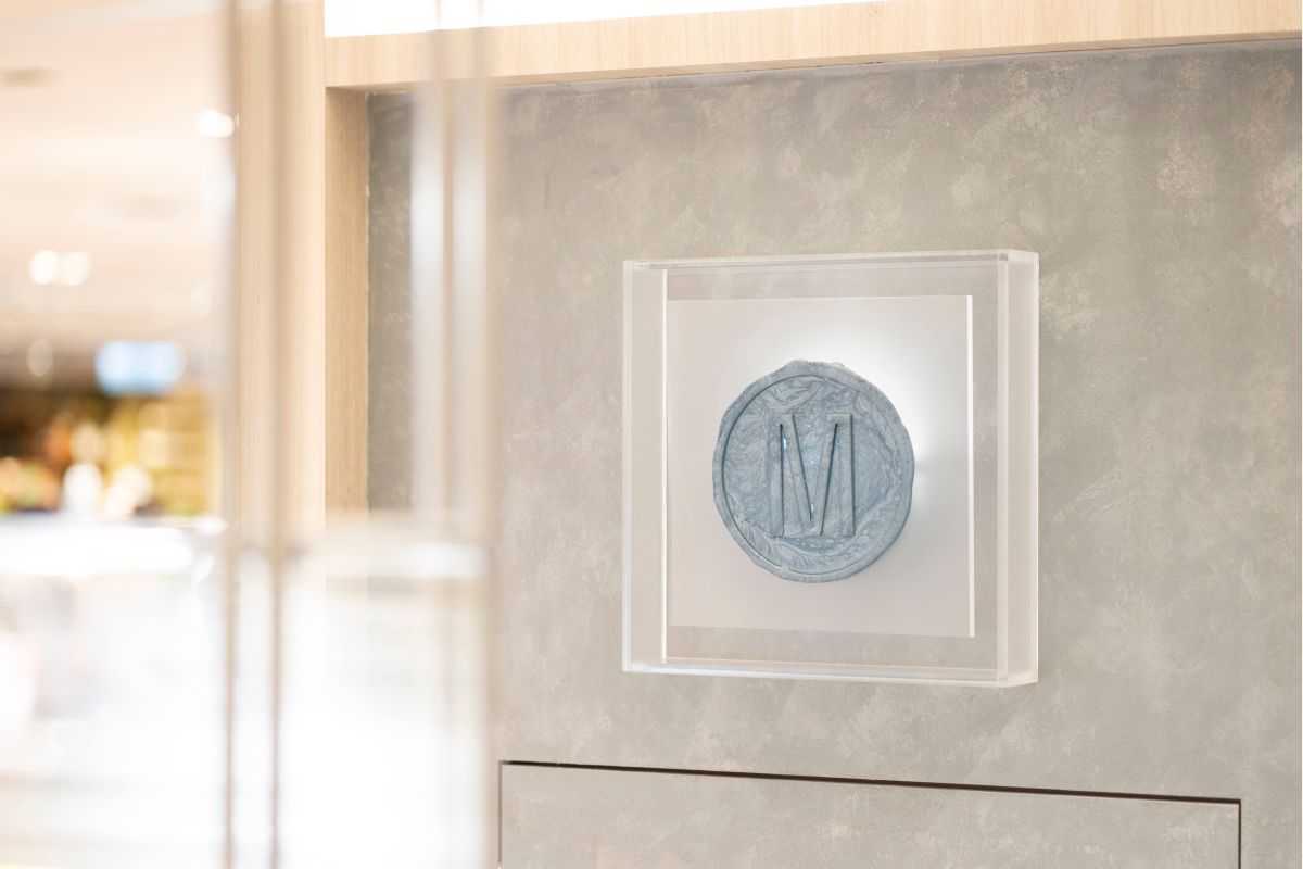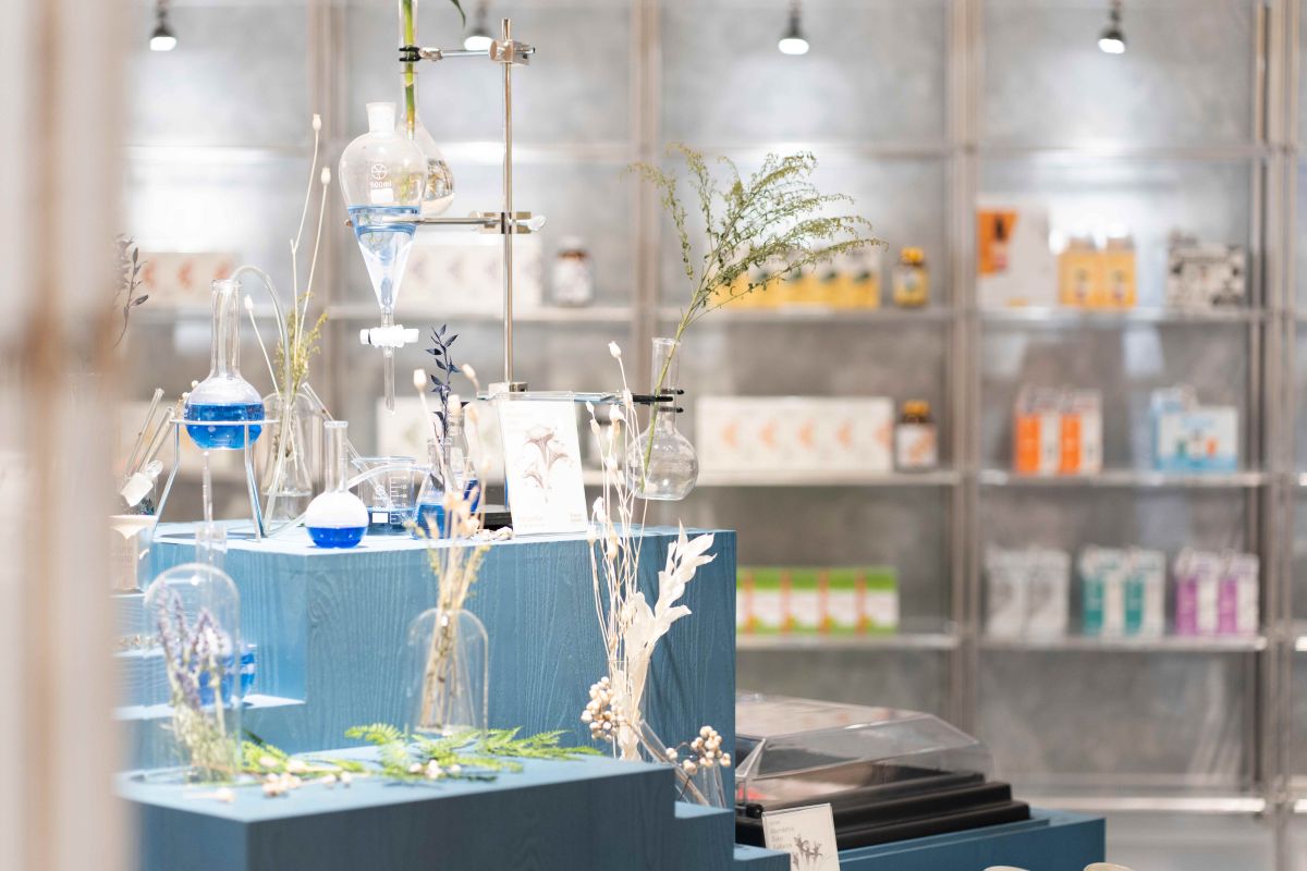 店舗設計は、店内中央に螺旋階段を配置し2階部分がギャラリーになった吹抜けのデザインの台中店舗も手がけた水相設計(WATERFROM DESIGN)によるもの。台北店のロゴデザインや床、設置台などに使用されているイメージカラーのブルーは、試行錯誤してできた“分子藥局ブルー”なんだそう。