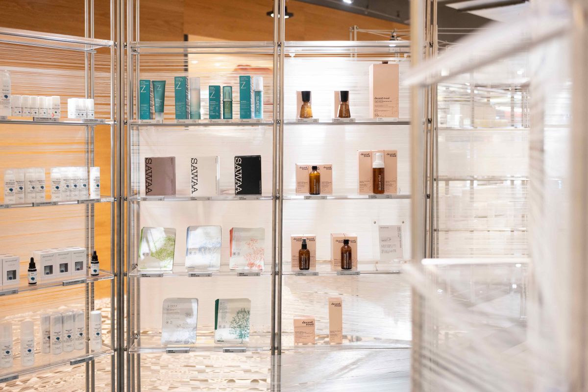 スペイン発のナチュラルスキンケアブランド「mid/night 00.00」や家具デザインから展開された雑貨「FRAMA」の香水やキャンドル。ほかスイス、ドイツ、フランスなどから厳選された天然成分のコスメが並び、薬局版のセレクトショップのよう。
