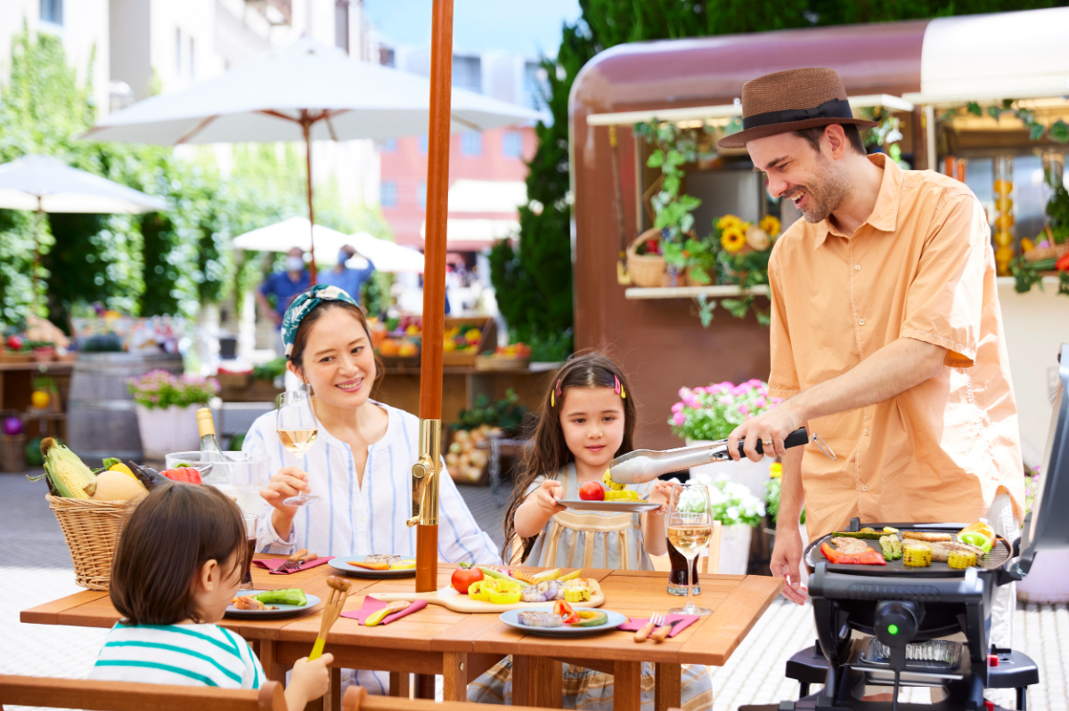 また、キッチンカーでは、野菜をカットする⼿間なく、すぐに⾷べられるように、あらかじめカットされた、ズッキーニ、パプリカ、とうもろこしなど10種類の「野菜セット」2000円を⽤意。グリル台やトング、カトラリーのレンタルが付いている「グリル台セット」1000円をレンタルして、⻘空の下、バーベキューを楽しめます。