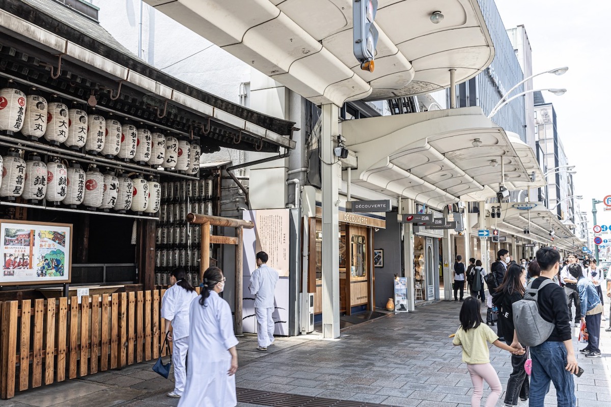 買い物を楽しむ人や観光客など多くの人で賑わう四条通は、阪急京都河原町駅と烏丸駅をつなぐ東西の通り。その間をいくつもの南北の通りが交差します。「京都 三代目 太三郎」があるのは、四条通と寺町通の交差点から2軒分東。京都を代表する百貨店のひとつ「藤井大丸」のすぐ近くです。