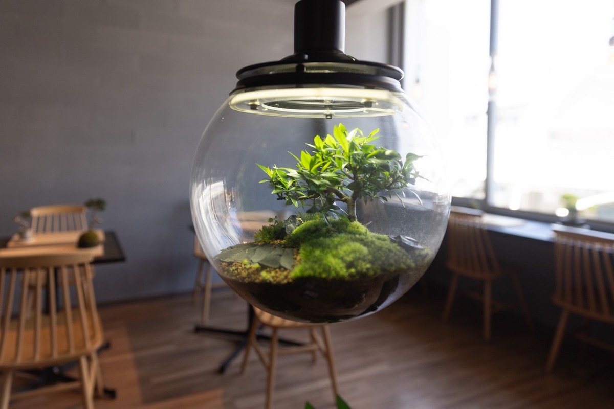 お店のコンセプトは和モダン。アイコンとなるのは盆栽で、2~4階の各フロアに印象的な盆栽が飾られています。小さな鉢のなかで枝葉を広げる植物の姿形から、その背景を感じる盆栽の世界と同じように、1つのテーブルの上で、1つの世界を完結できるようにプロデュースされています。
