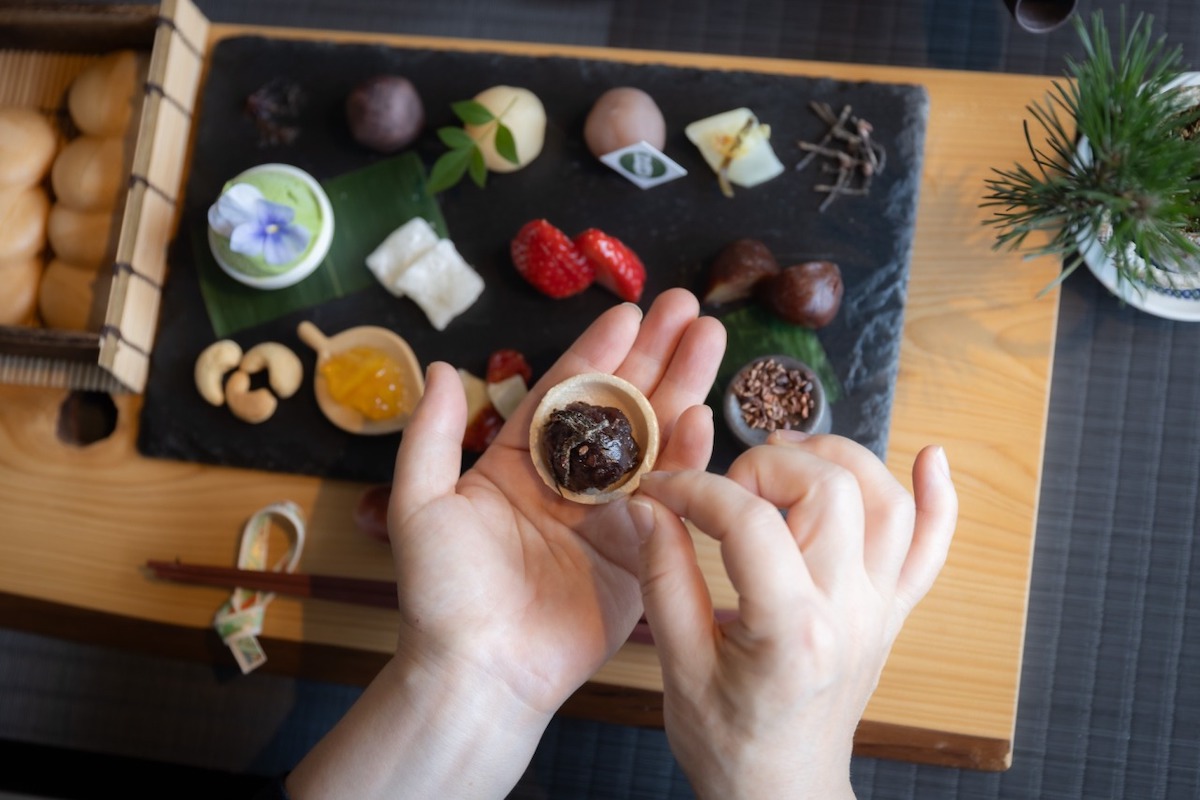 まず試してみたのは、白あんにジャムとドライトマト。甘さ控えめのあんこに柑橘のさわやかな酸味とうま味を凝縮したドライトマトの果肉感が加わり、絶妙です。今まで試したことのない食べ合わせですが、おいしい発見。