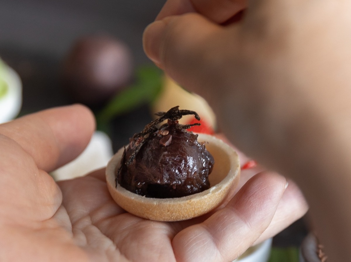 箸休め的な梅の塩昆布をあんこと合わせて、甘辛ミックス。さらにカカオニブをまぶして食感をプラス。あんこの甘みと昆布の塩気、梅の酸味がお互いを引き立てあって、これもまた美味。日本茶ととてもよく合います。