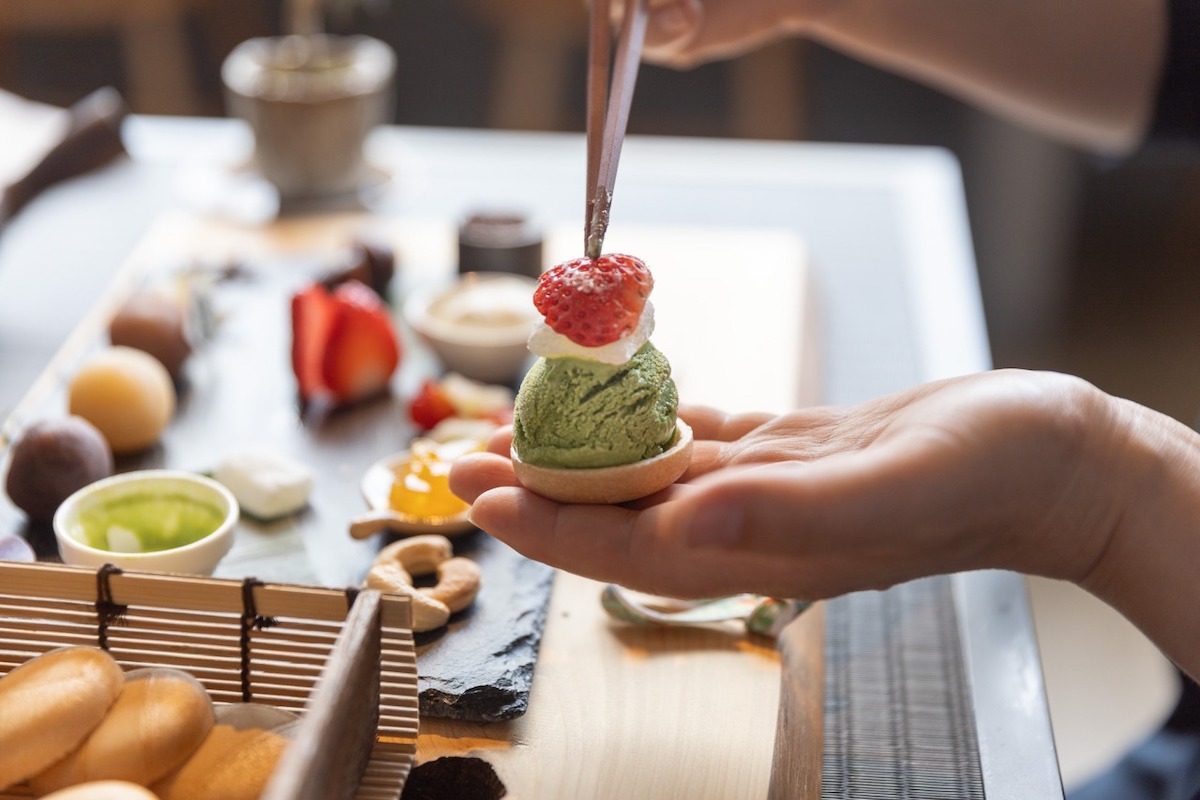 抹茶のアイスは求肥と合わせて、求肥のぷにぷに食感とひんやりアイス、イチゴのみずみずしさも一緒に味わいます。和菓子とフランス菓子のパーツがお互いのよさを生かしつつ、調和するように計算された最中セット。誰かと訪れるなら、どんなオリジナルの最中を作ろうか一緒に考えながら試すと盛り上がりそうです。