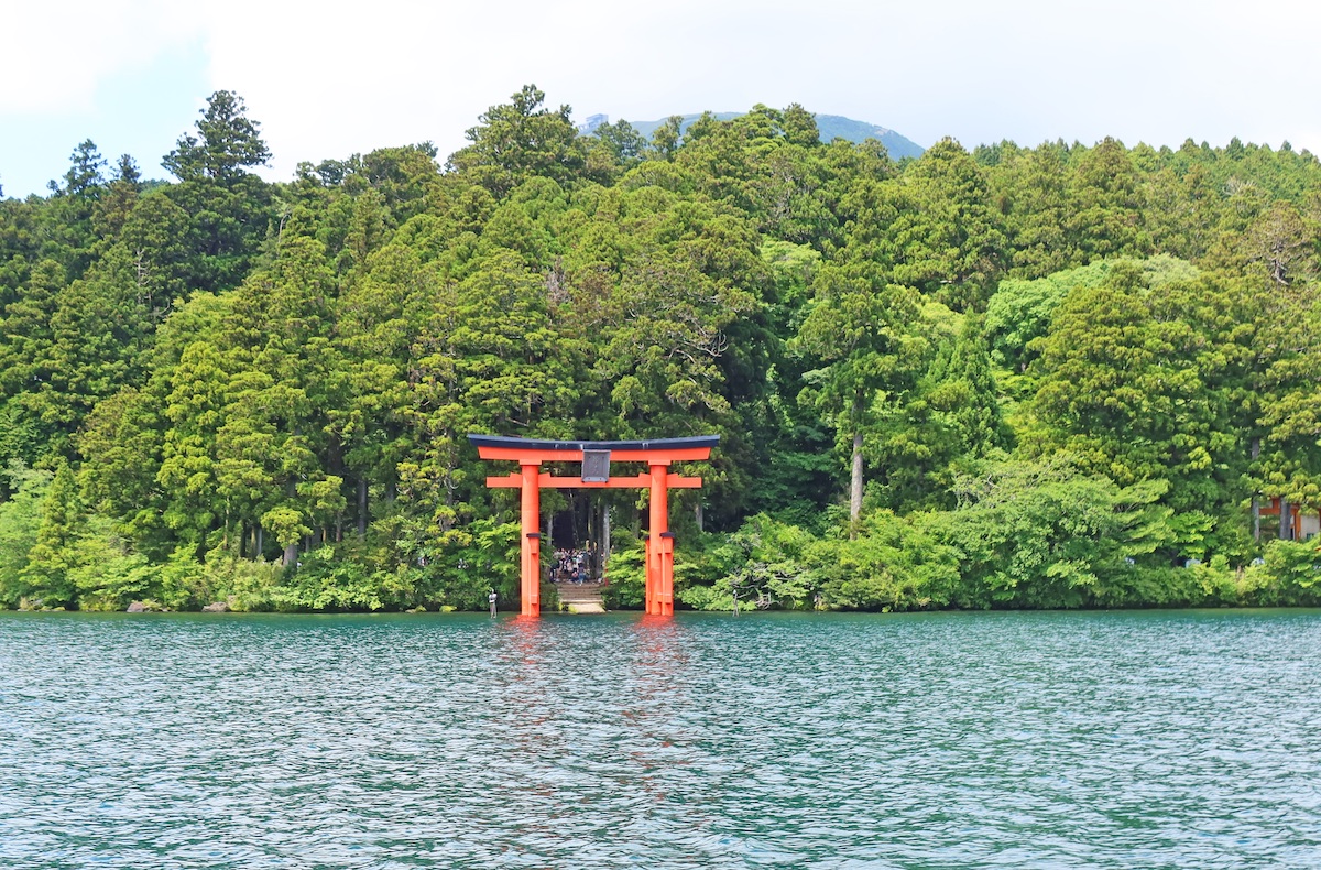 元箱根港近くでは箱根神社の「平和の鳥居」が間近に見られます。天気がよければ富士山も見えますが、取材当日はあいにく姿を見せずでした。