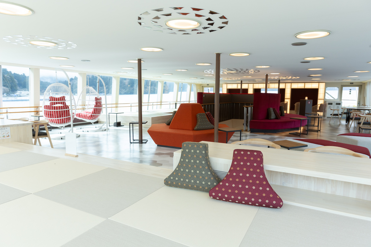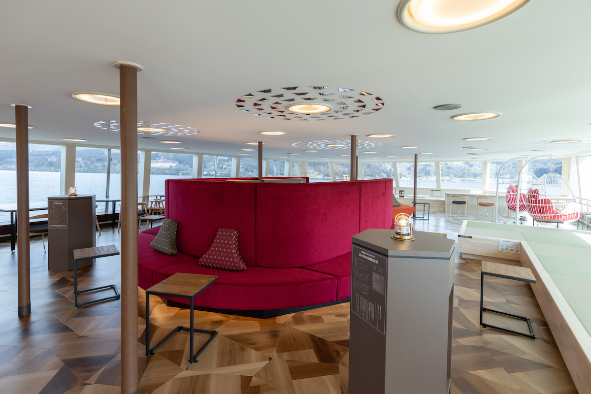 船内やデッキ合わせてなんと15種類ものシートやベンチが用意されています。小上がりスペースや、赤富士をイメージしたソファ席、湖を見つめながらゆっくりと過ごすことのできるカウンター席……。明るい空間であちこち船内を歩き回りたくなる演出はまさに川西デザインの真骨頂。一部をご紹介します。