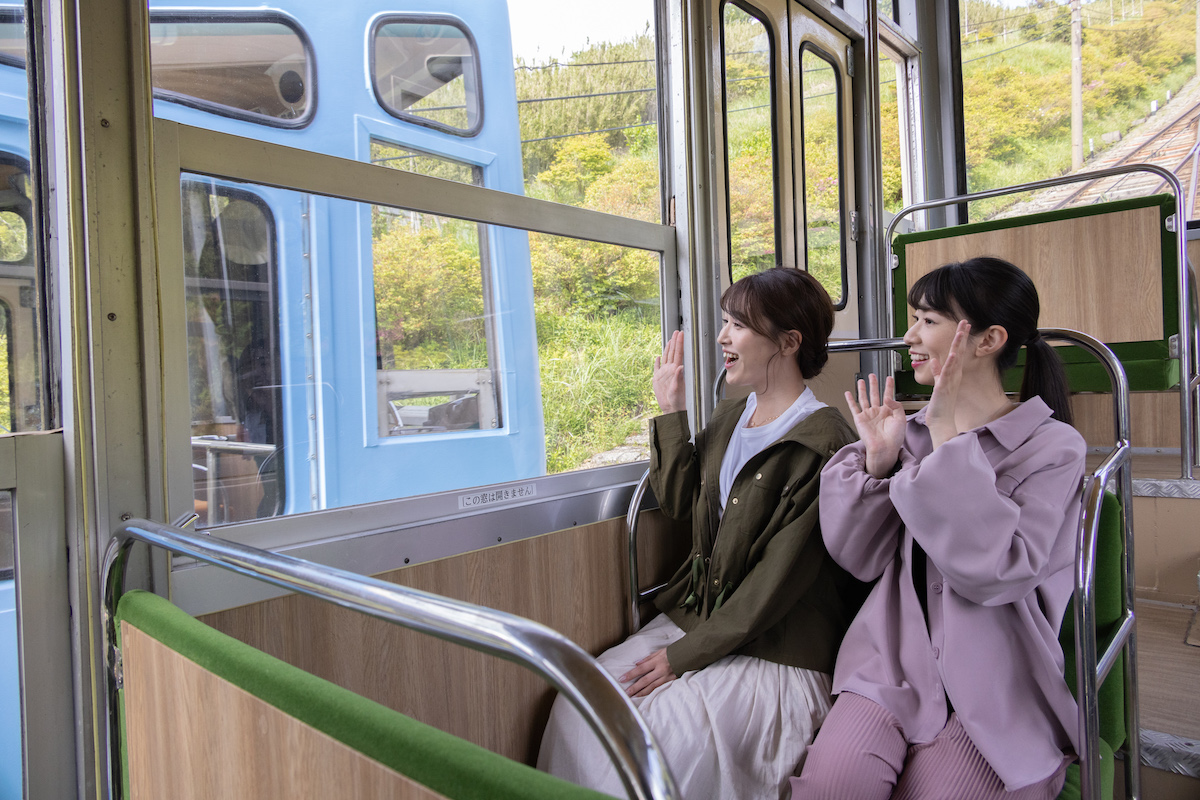 車両は「十国号」と「日金号」の2両があります。「十国号」は、見渡す限りの青空をイメージしたスカイブルー色の車体、もう1両の「日金号」は富士山など十国峠を囲む山々をイメージしたアクアグリーンの車体で、ヘッドマークは山頂から望む山々の稜線をイメージしたものです。