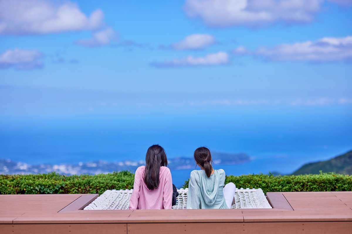 十国峠山頂駅に着いたら、2022年にオープンした「PANORAMA TERRACE 1059」へ。駅に到着し外に出ると、一面360度のパノラマが広がります。夏は空の青と山の緑のコントラスが鮮やか。山々を一望できるデッキや寝転びながら駿河湾や相模湾の景色を楽しめるハンモック付きのデッキでぜひ絶景を楽しんで。