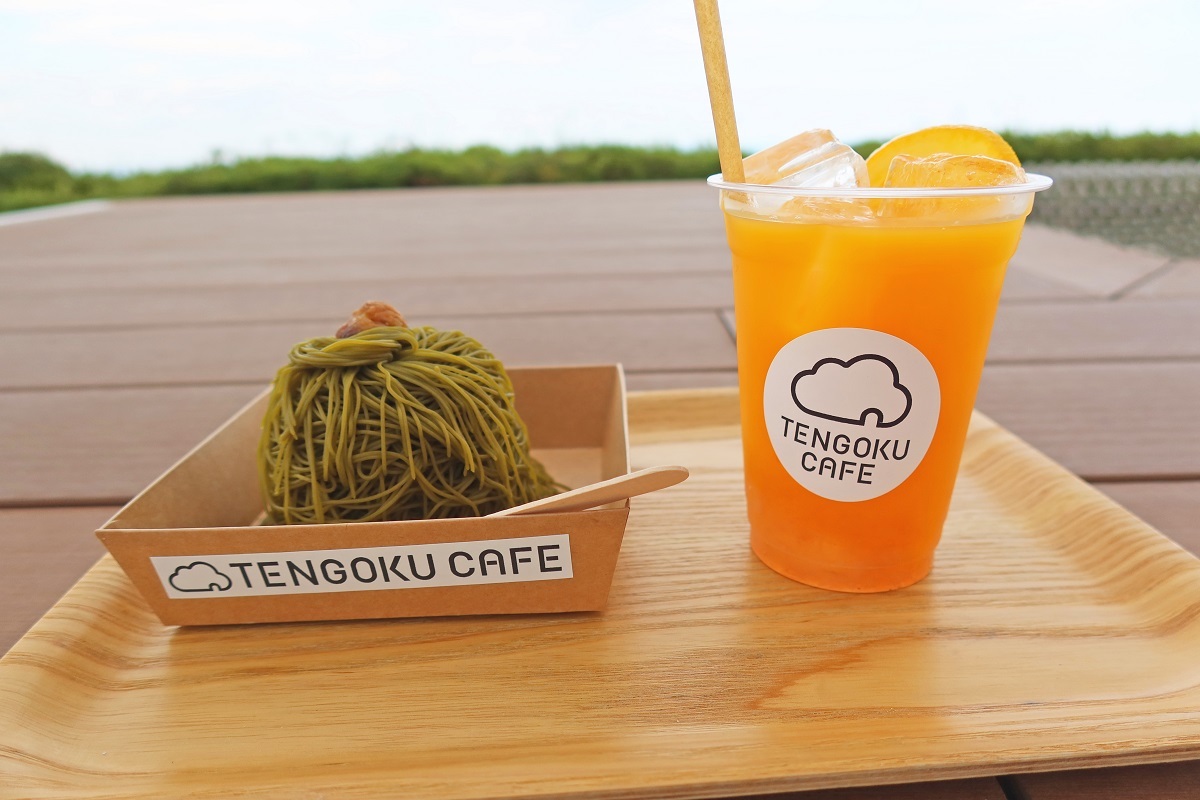 ぜひ立ち寄りたいのが、十国峠山頂駅に接続した建物にある地産地消カフェ「TENGOKU CAFE(てんごくかふぇ)」。店内のテラスは大自然に囲まれた特等席(店舗利用者のみ利用可能)。静岡県産茶や牛乳など地元食材を使用したメニューが魅力です。