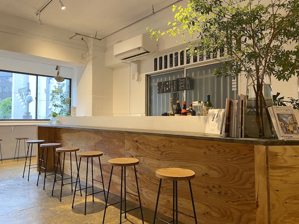 店内は、白をベースに温かみを感じる木のインテリアや観葉植物が配置された心地いい空間。店主いわく、人の思考を邪魔しないラフな空間をイメージして、落ち着いた色調でまとめ、刺激的なものを置かないレイアウトにしたそう。入り口付近の手前と、奥の2つのエリアで構成されていて、手前は購入できる本がずらりと並んだ空間、奥はカフェバー利用できるスペースを中心に、本棚もいくつか置かれた空間になっています。
