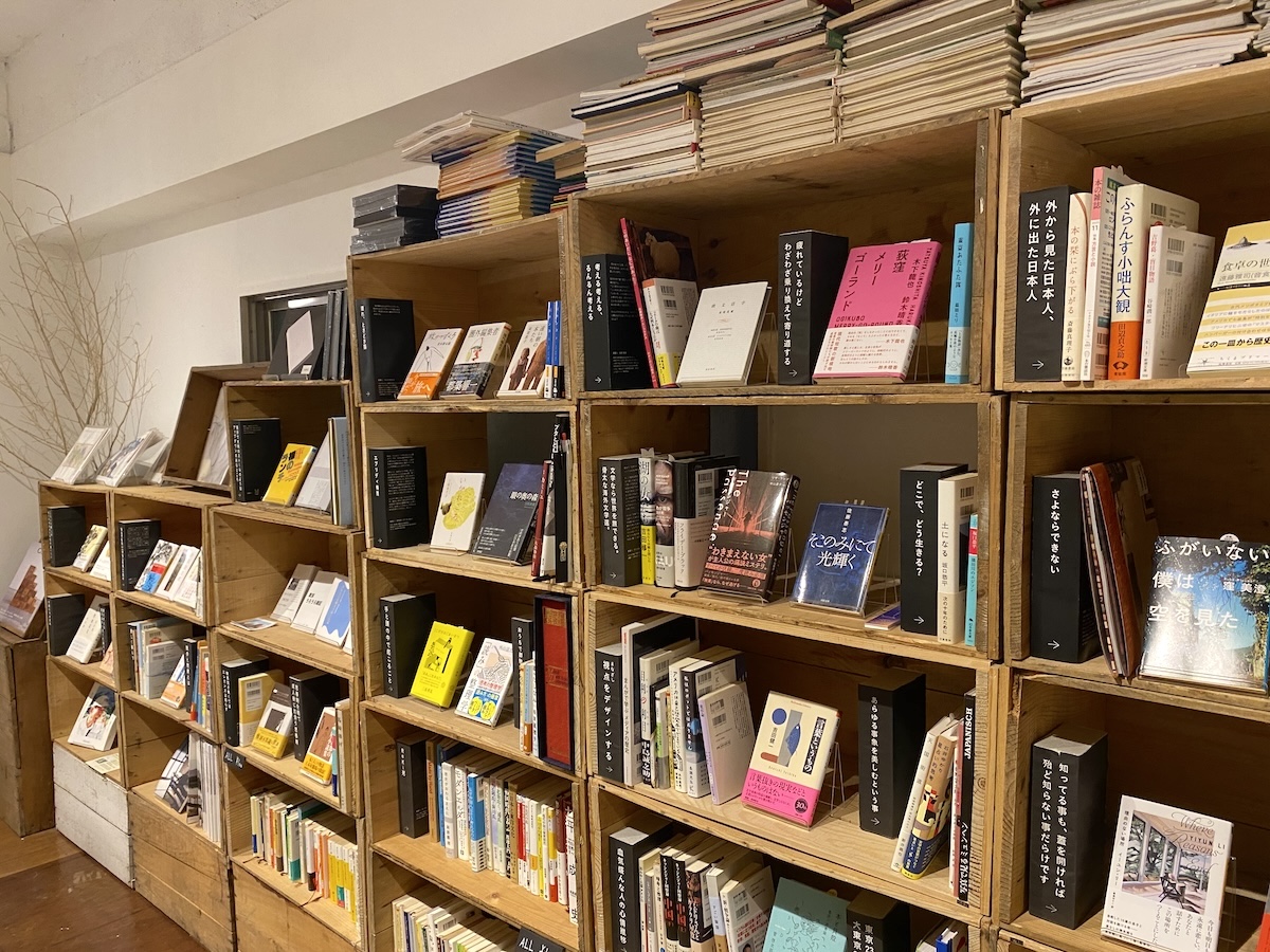 店内の本棚は、すべてリンゴ箱でできていて、使い込まれた感じがとてもエモーショナルで素敵。店主の弟さんが都内でリンゴの販売店を営んでいることに由来するのだそう。