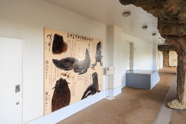 このオットセイ・アザラシエリアでは、プール上の通路に掲示している個体ごとの特徴を描いたイラストボードを2023年10月にリニューアル。筆跡が見てとれる迫力のイラストは美大の学生さんたちによるもの。画力と飼育スタッフの愛とが掛け合わさって、見ごたえ十分です。