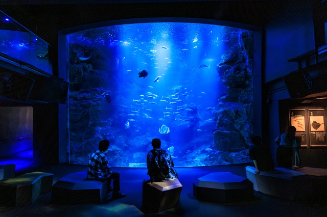 ちょっと疲れたかな?と思ったら、日本海を底から見上げているようなしつらえの「京の海」大水槽前で贅沢なひと休みを。海の岩をイメージしたソファに座り、時間を忘れて海の中にいるような没入感を楽しむことができます。