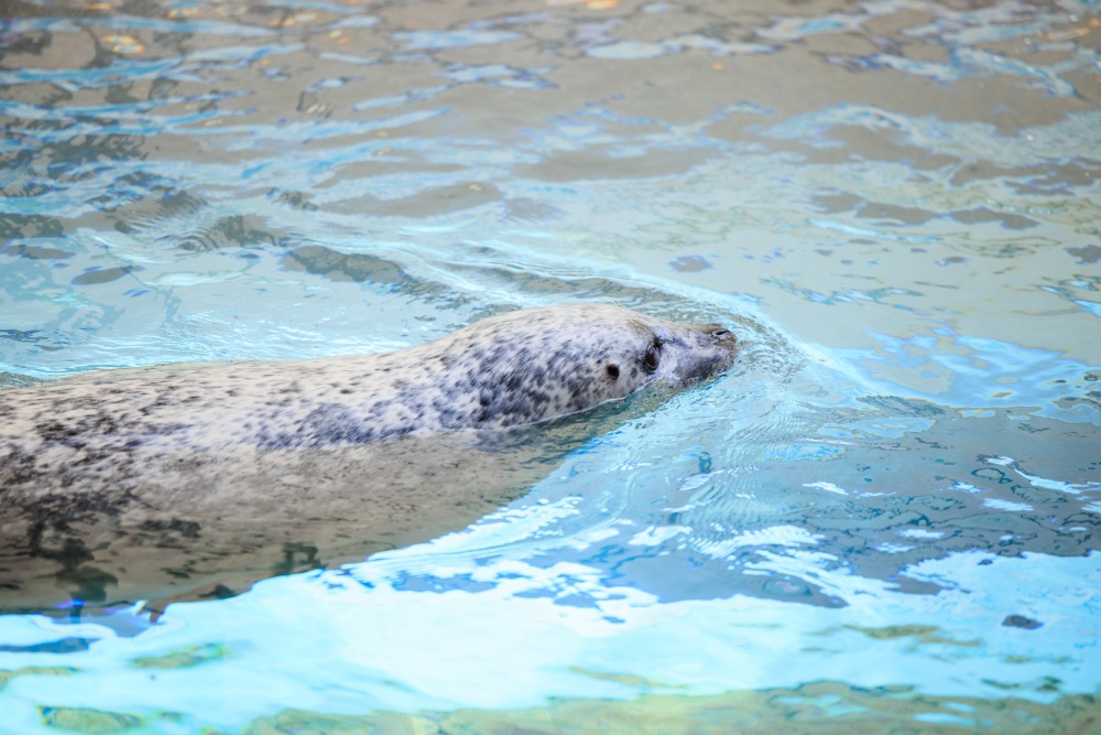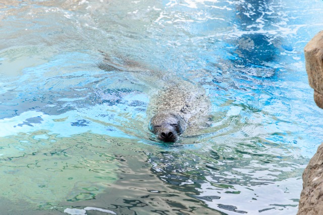 先に進むと、半屋外のエリアでミナミアメリカオットセイとゴマフアザラシたちが気持ちよさそうにスイスイ。プールから少し離れたところに設置されたチューブ状の水槽に、アザラシがやってくることも。愛くるしいしぐさが見られる仕掛けがたまりません。