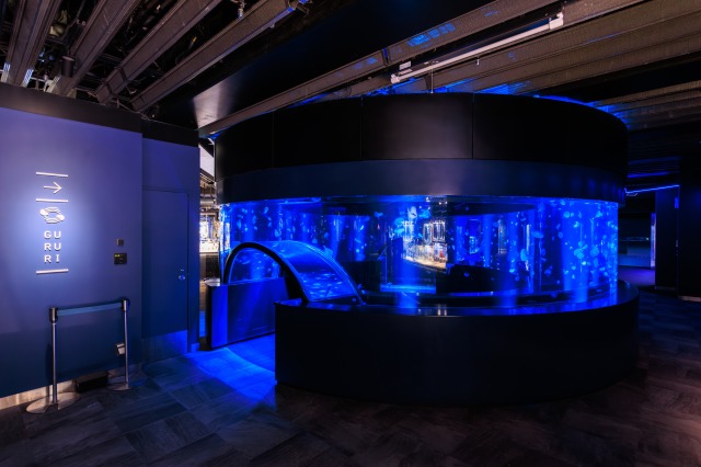 360度ぐるっと見回せる水槽「GURURI」。約1500匹のミズクラゲが漂う幻想的な水中空間が広がり、まるでクラゲと一緒に海に浮かんでいるかのような体験ができます。