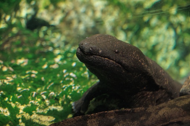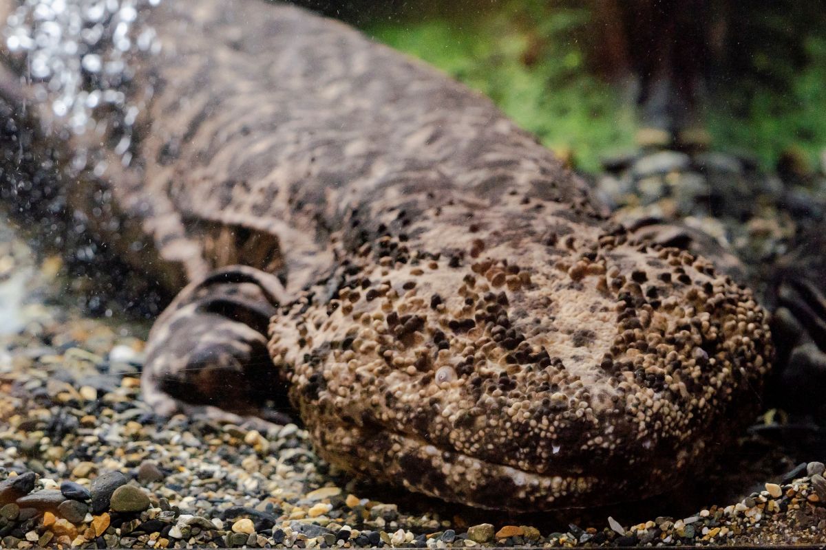 チュウゴクオオサンショウウオとの交雑個体はミルフィーユのように重なって「京の川」エリア入ってすぐのところでお出迎えしてくれます。