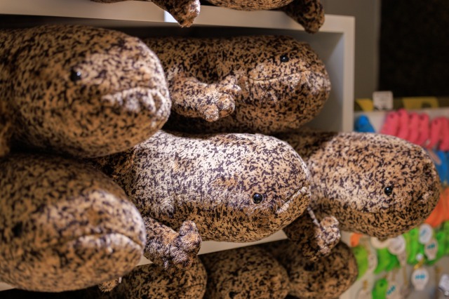 ショップでは、忠実かつキュートにデザインされた、超がつく人気商品「オオサンショウウオぬいぐるみ」が並びます。超特大サイズは約155㎝もありインパクト抜群。オオサンショウウオのかわいさを、ぜひ持ち帰ってお家でも堪能してください。