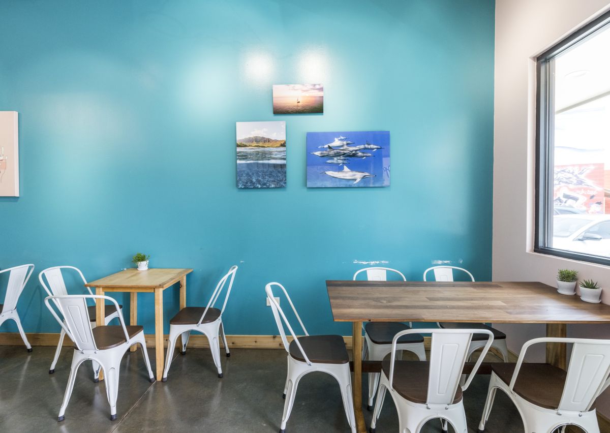 外観はシンプルですが、一歩中に入るとミントグリーン&ピンクを基調としたおしゃれな空間が広がります。店内に飾られたアートは、ローカルアーティストの作品や、オーナーであるマイカさんのお母様の絵もあり、やさしい雰囲気に癒されます。