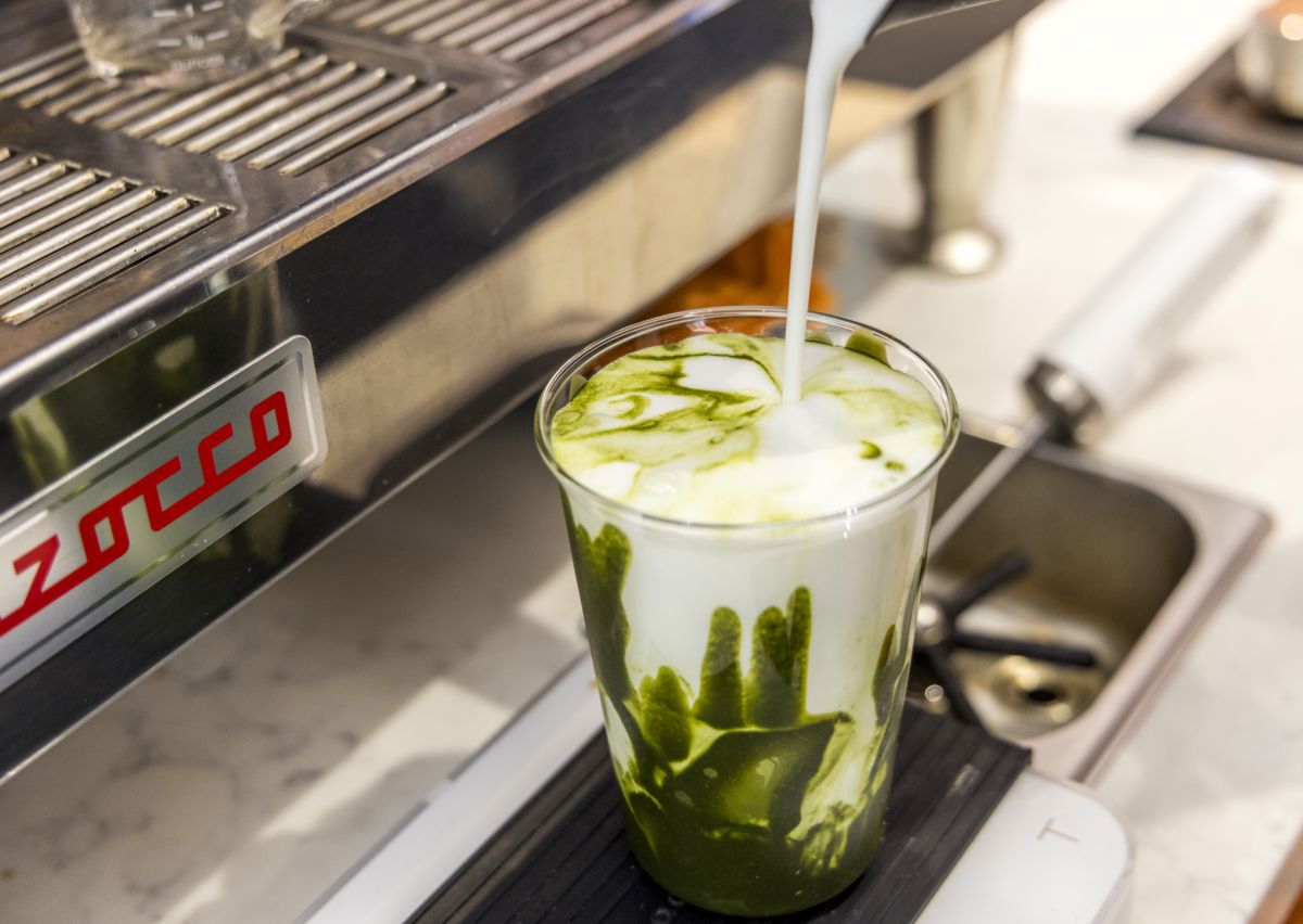 また、上質な抹茶を贅沢に使った「ハニーローズ抹茶ラテ」も人気のメニュー。濃いめの抹茶をしっかり点てた中にハニーローズがほんのり香る特製クリームが入った、「パイ・カフェ」のシグネチャードリンクです。