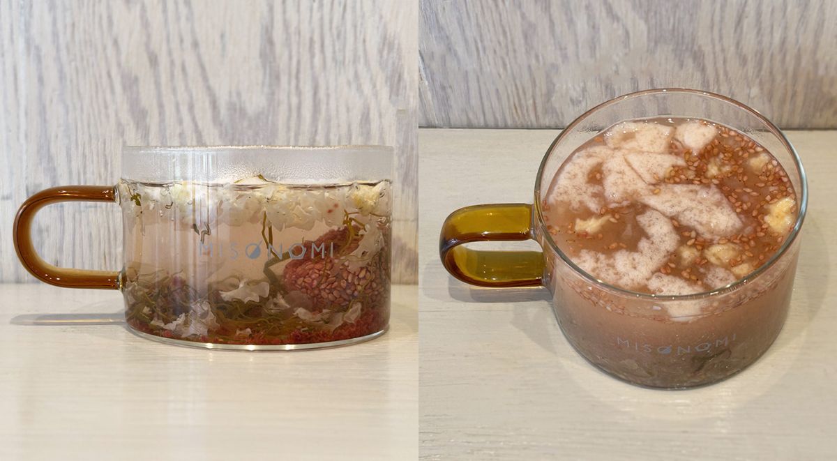 店名にもある“MISONOMI(みその実)”とは、味噌スープの実のこと。もなかの上にカラフルなフリーズドライの具材&生味噌を盛り付けていて、お湯を注ぐとおいしい味噌スープが完成します。