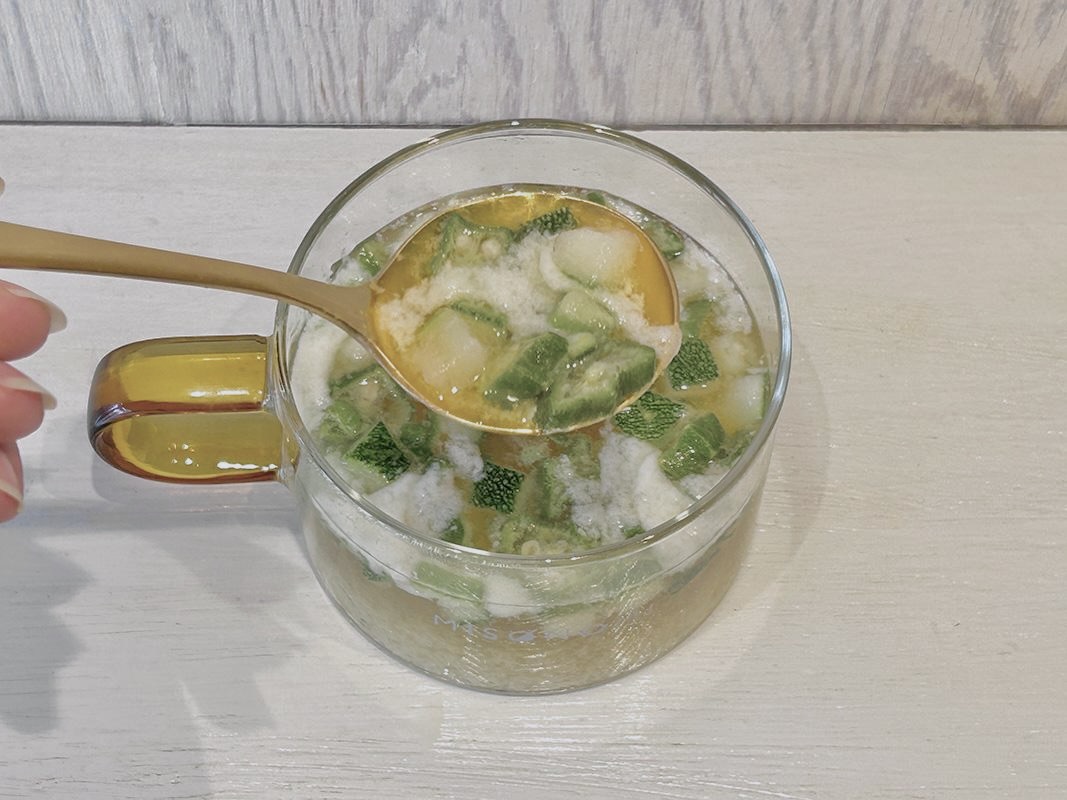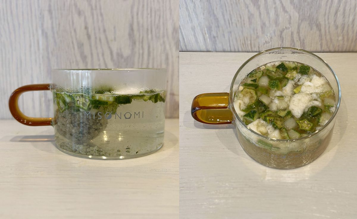 スープに浮かぶズッキーニ&オクラの鮮やかな緑色、もなかの白が差し色になっていてきれい!