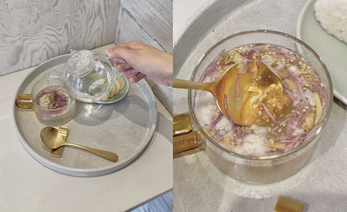 食前に加賀棒茶&和三盆が出てくるので、それを味わいながらオリジナルの“みその実”を製作。メインの食事は、自分で作ったオリジナル味噌スープ、塩おにぎり、たくあん漬けです。食後にはお好きなドリンク&和三盆が出てきます。