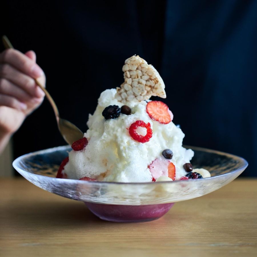 「氷菓 ~ベリーと練乳~」1200円は、濃厚な練乳ソースの甘みと、トッピングした4種のベリーの酸味のバランスが抜群の、夏らしいさわやかなかき氷。白玉やトッピングした玄米パフの食感も楽しい一品です。ふわふわの氷の中の、生クリームとベリーソースを絡めて味わってみて!