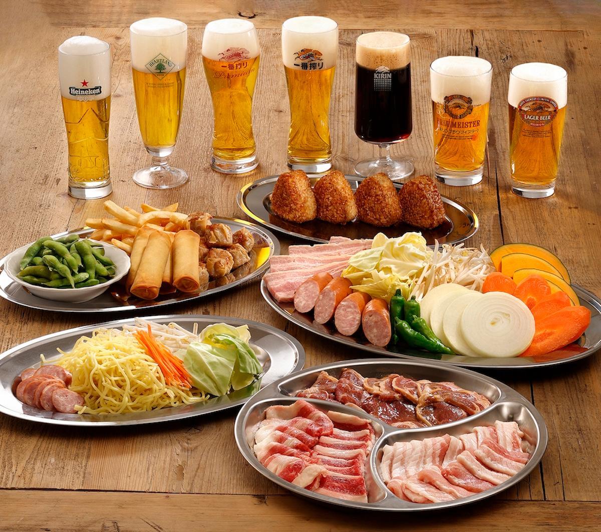 料金:スタンダードプラン(ブラックアンガス牛、骨付き牛カルビ、野菜盛り合せなどBBQセット)アルコール飲み放題5500円、ソフトドリンク飲み放題4500円