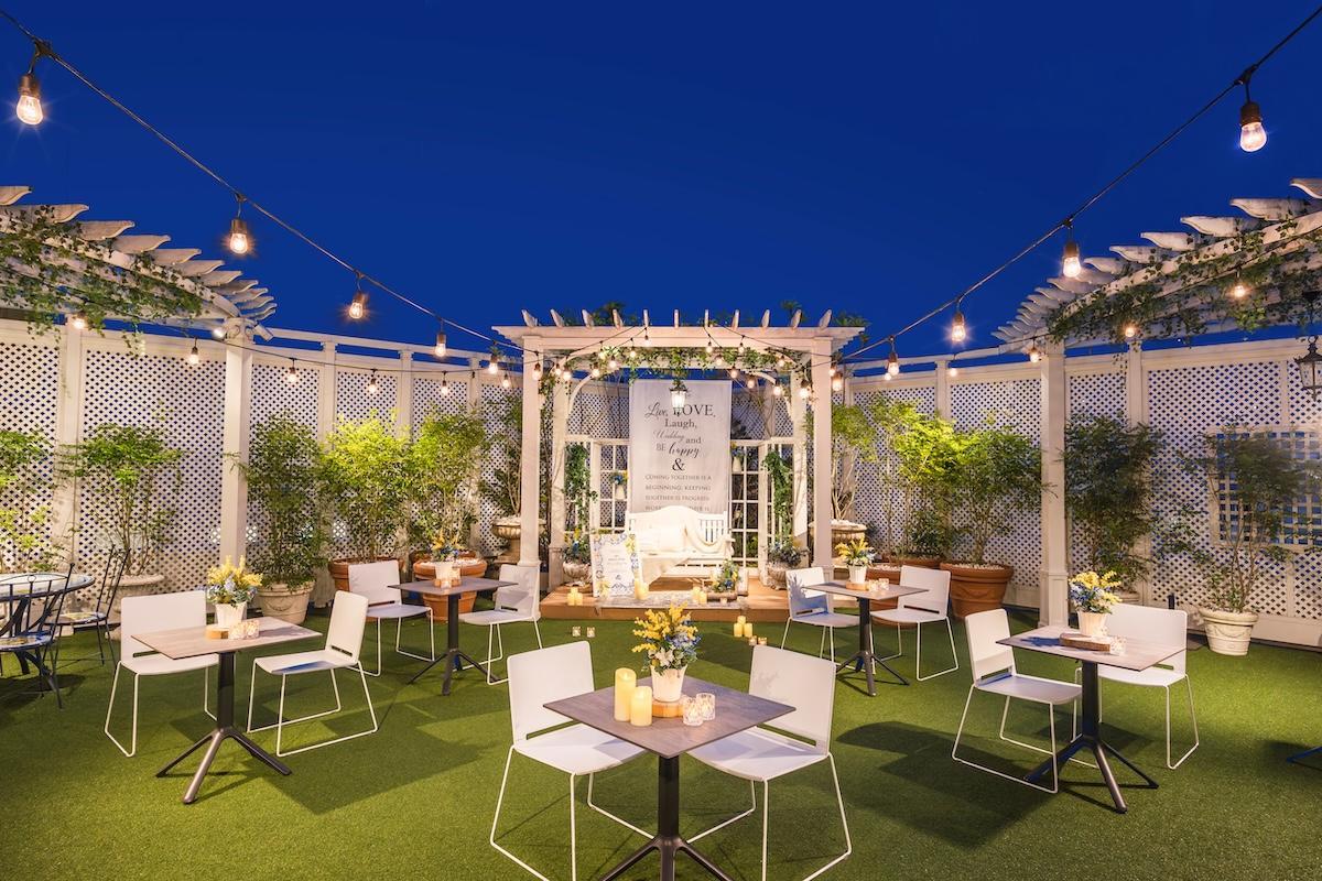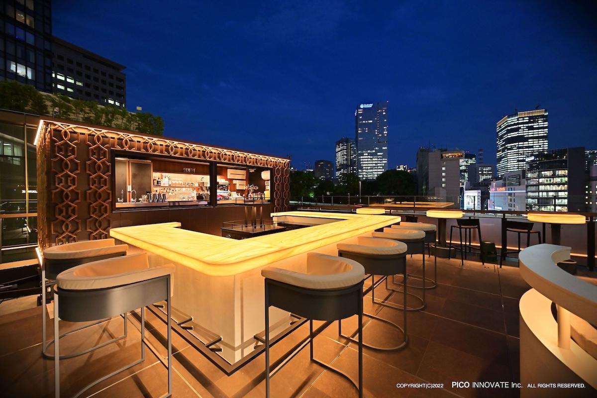 ライトアップされたルーフトップテラスは、非日常を感じる落ち着いた空間に。武道館やお堀を望む開放的なロケーションで、ゆったりとした時間を過ごしてください。