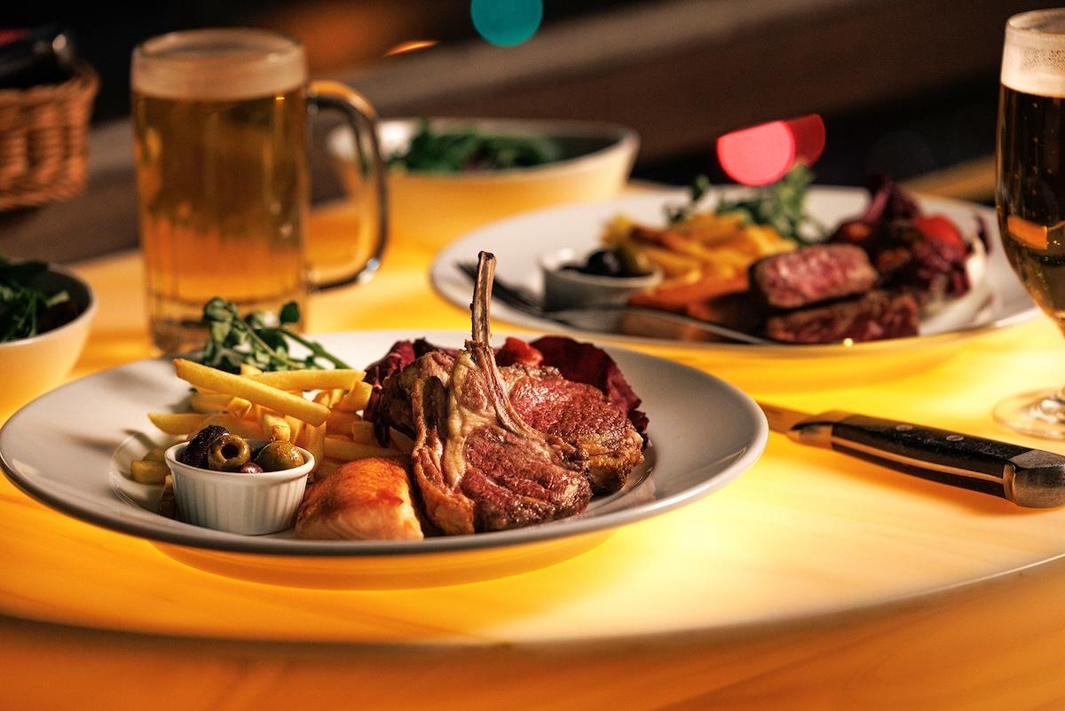 ワンプレートで提供される料理は「ラムチョップ プレート」または「ステーキバイツ プレート」の2種類から選べ、それぞれ「ベンジャミン ステーキハウス」こだわりのお肉料理をメインに、サーモンのグリル、サラダ、フライドポテト、グリルドベジタブルなどが添えられたぜいたくな内容です。