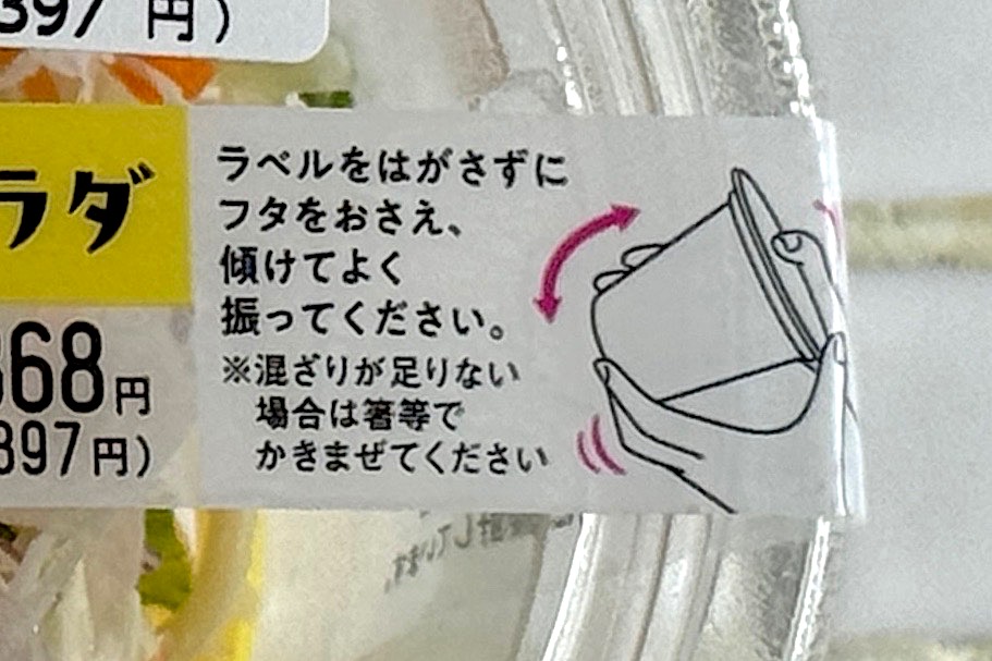 「ラベルをはがさずにフタをおさえ、傾けてよく振ってください」と、カップのフタのシールに、食べ方が書かれています。