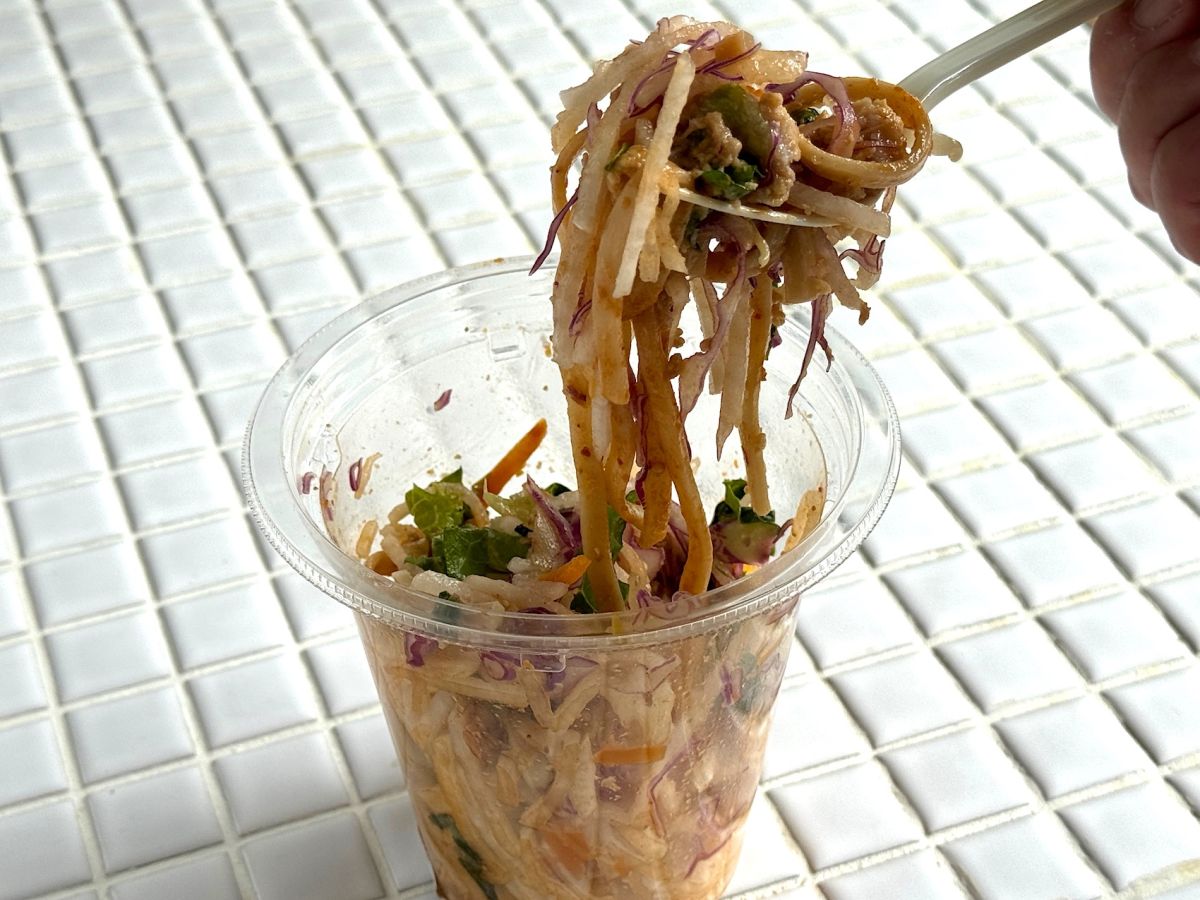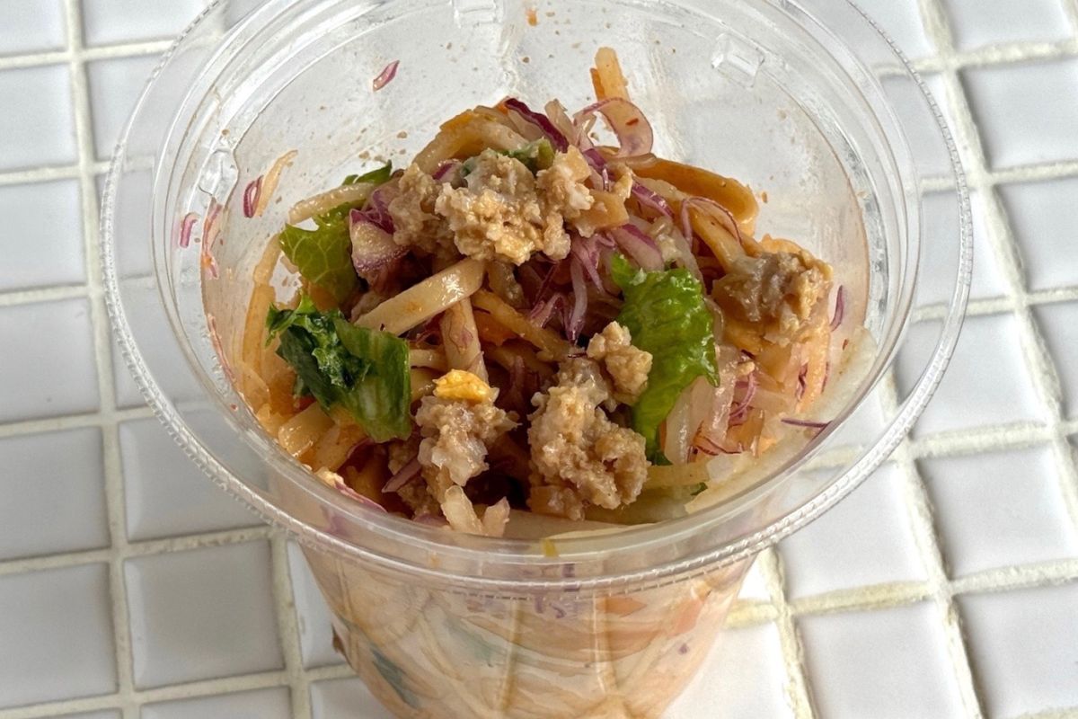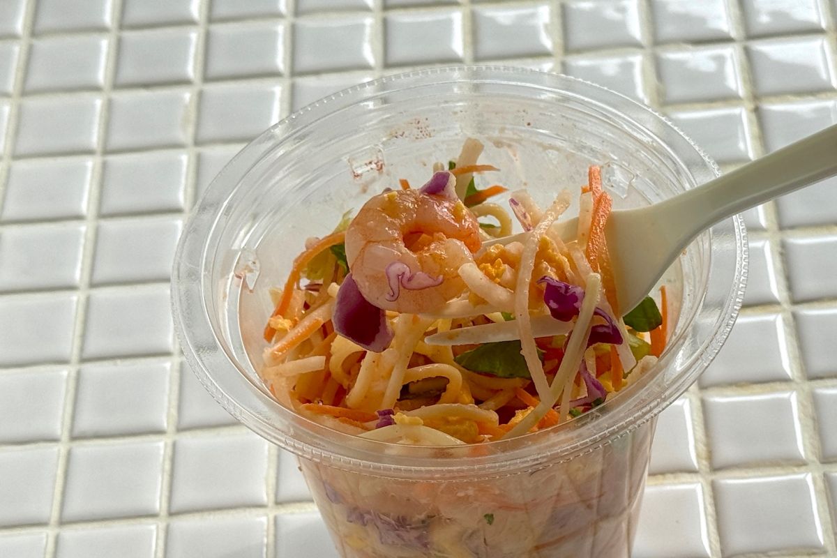 エビがカップの底に隠れてしまったので、掘り起こしていただきます。プリッとした食感と甘みのあるエビが、明太風味のドレッシングと合わさって風味豊か。パスタはクリーミーさの奥にピリッと辛さのある明太子ドレッシングとよく絡まります。ほろほろとした玉子、細切りのニンジンや大根のシャキシャキとした食感がアクセントになって、最後まで軽快に、おいしく食べられました。