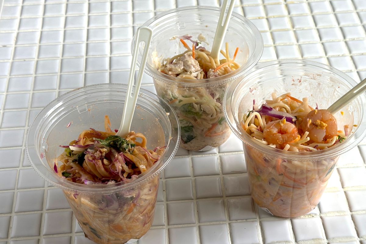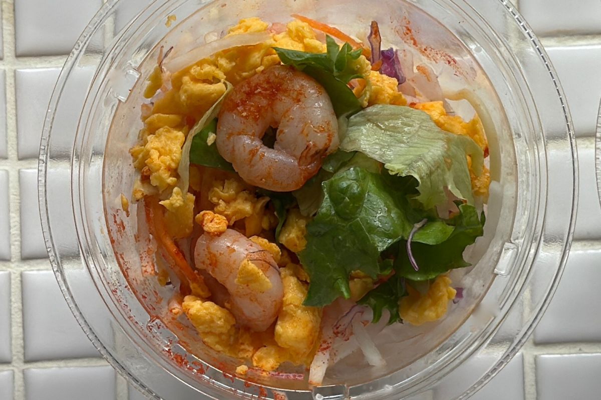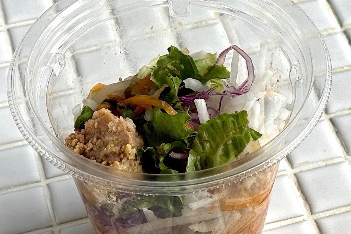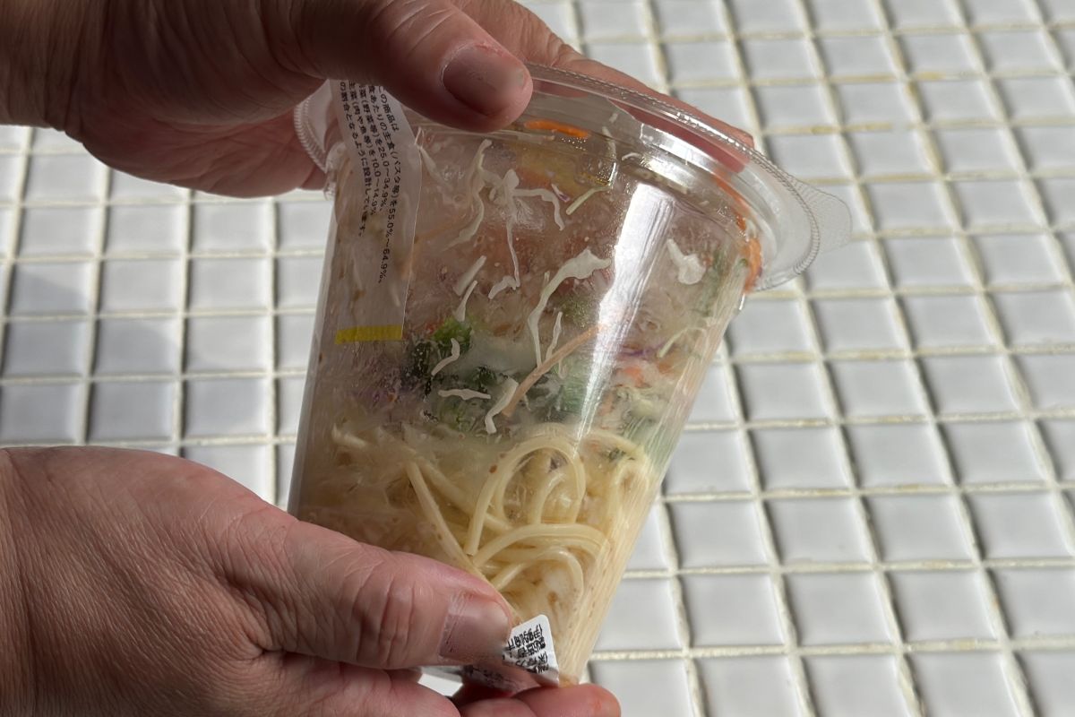 エビがカップの底に隠れてしまったので、掘り起こしていただきます。プリッとした食感と甘みのあるエビが、明太風味のドレッシングと合わさって風味豊か。パスタはクリーミーさの奥にピリッと辛さのある明太子ドレッシングとよく絡まります。ほろほろとした玉子、細切りのニンジンや大根のシャキシャキとした食感がアクセントになって、最後まで軽快に、おいしく食べられました。