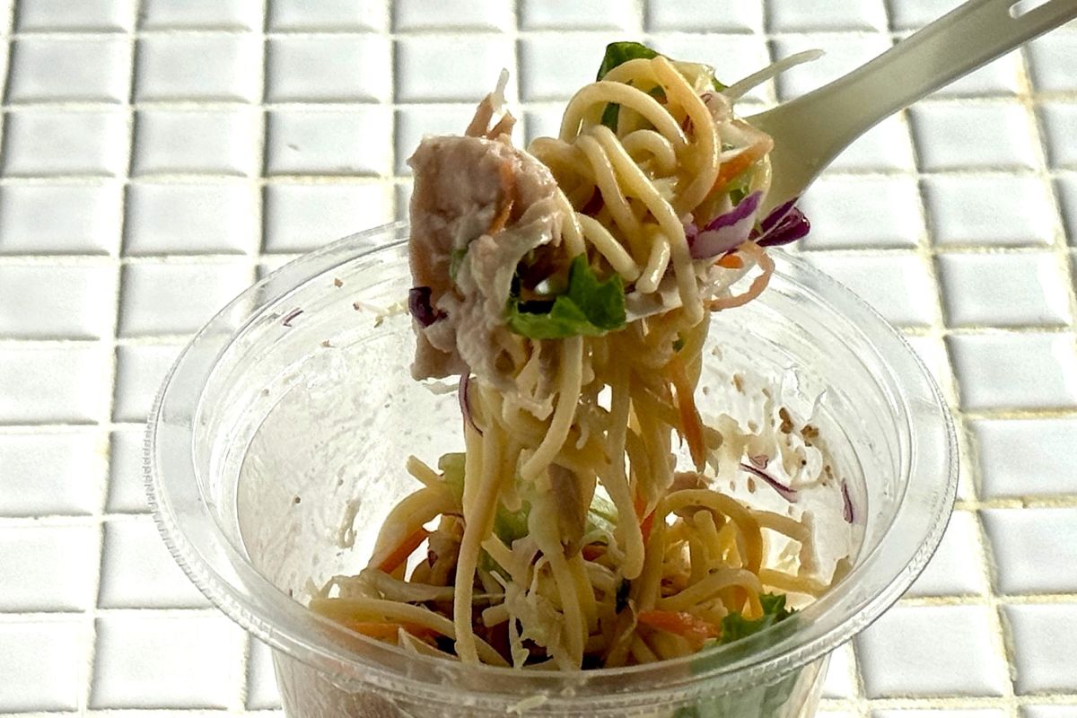 ごまドレッシングとポン酢ジュレが、パスタや具材全体に絡まって、濃厚かつ酸味のあるさわやかな味わい。豚しゃぶはやわらかく、野菜はシャキシャキ。パスタはパッと見よりボリュームがあって、意外と食べごたえがありますよ。