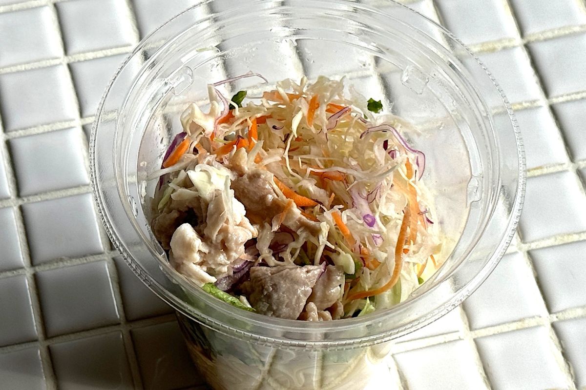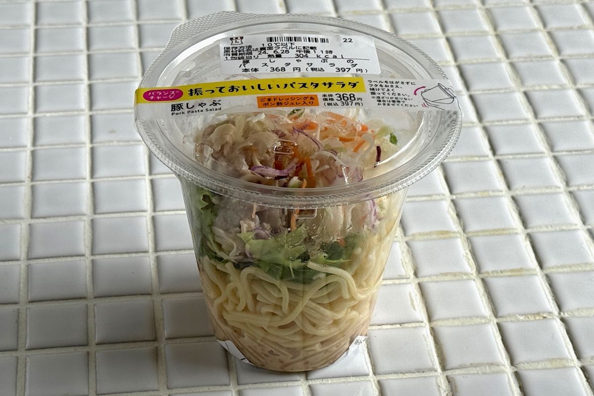 最初にご紹介するのが人気NO.1の「振っておいしいパスタサラダ 豚しゃぶ」397円。カップの下の方にごまドレッシングが入っていて、パスタ、ポン酢ジュレ、野菜、豚しゃぶが重ねられています。