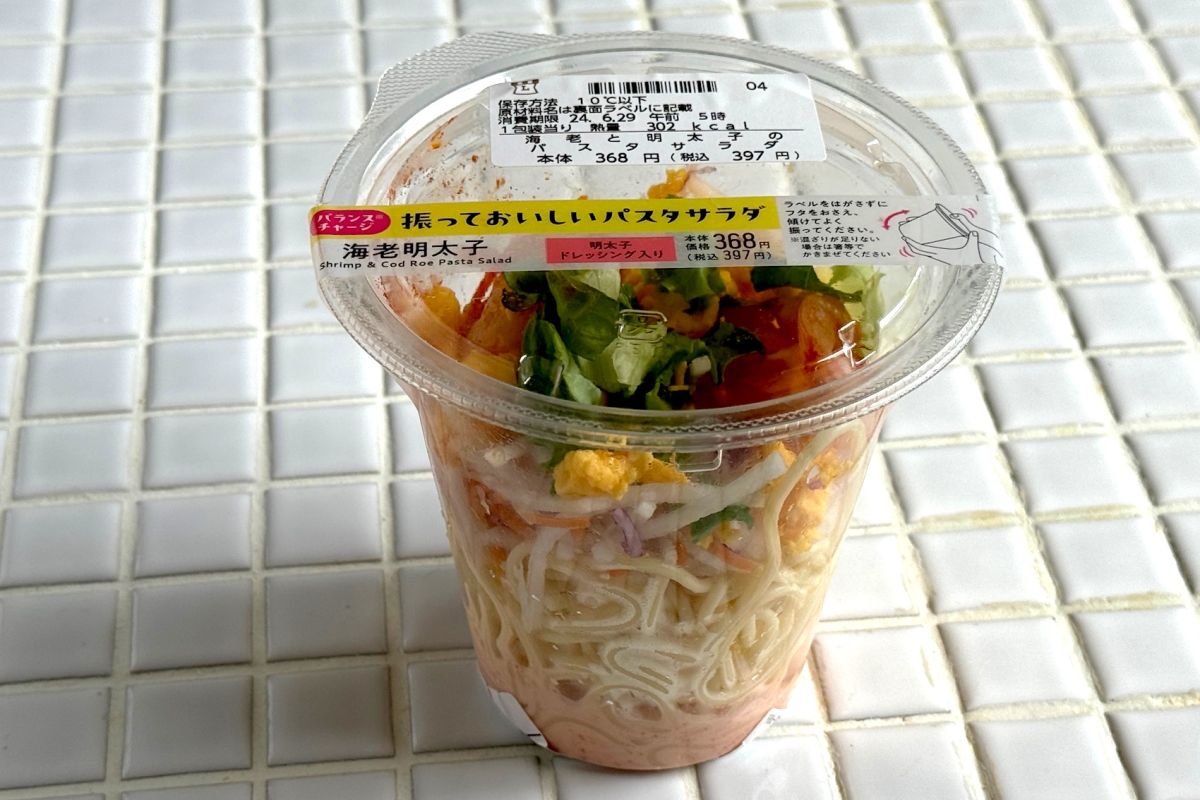 次にご紹介するのは、人気No.2の「振っておいしいパスタサラダ 海老明太子」397円。