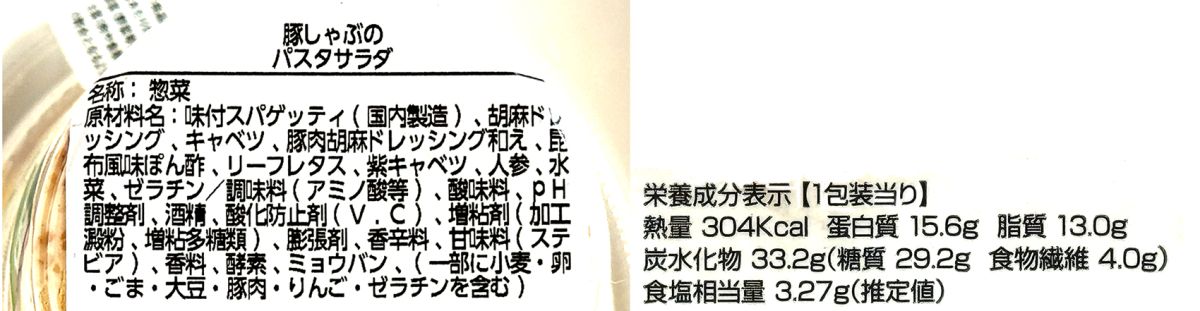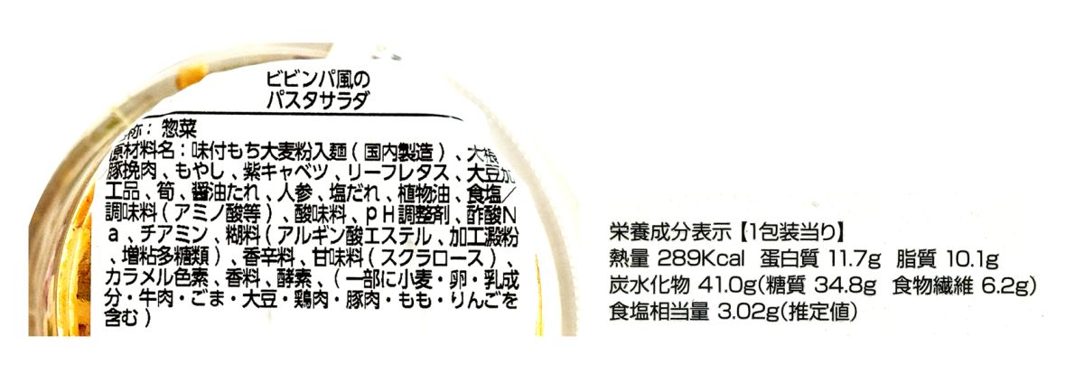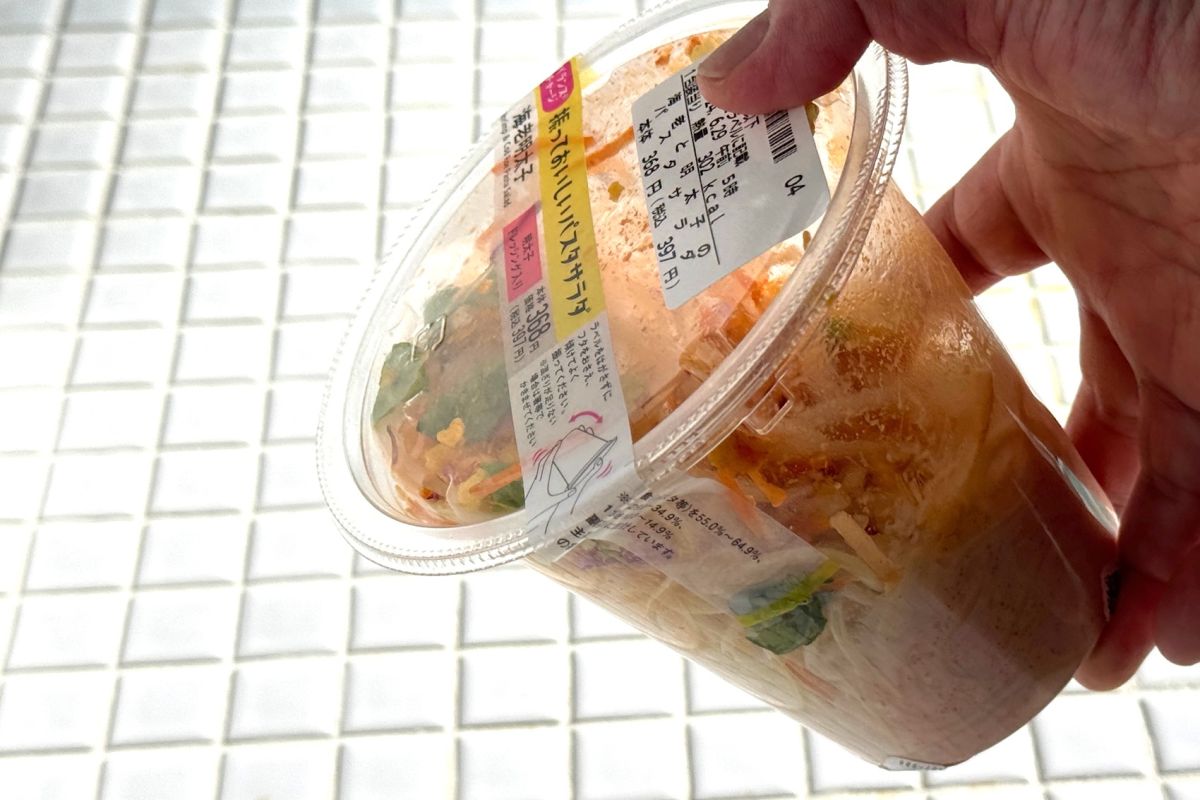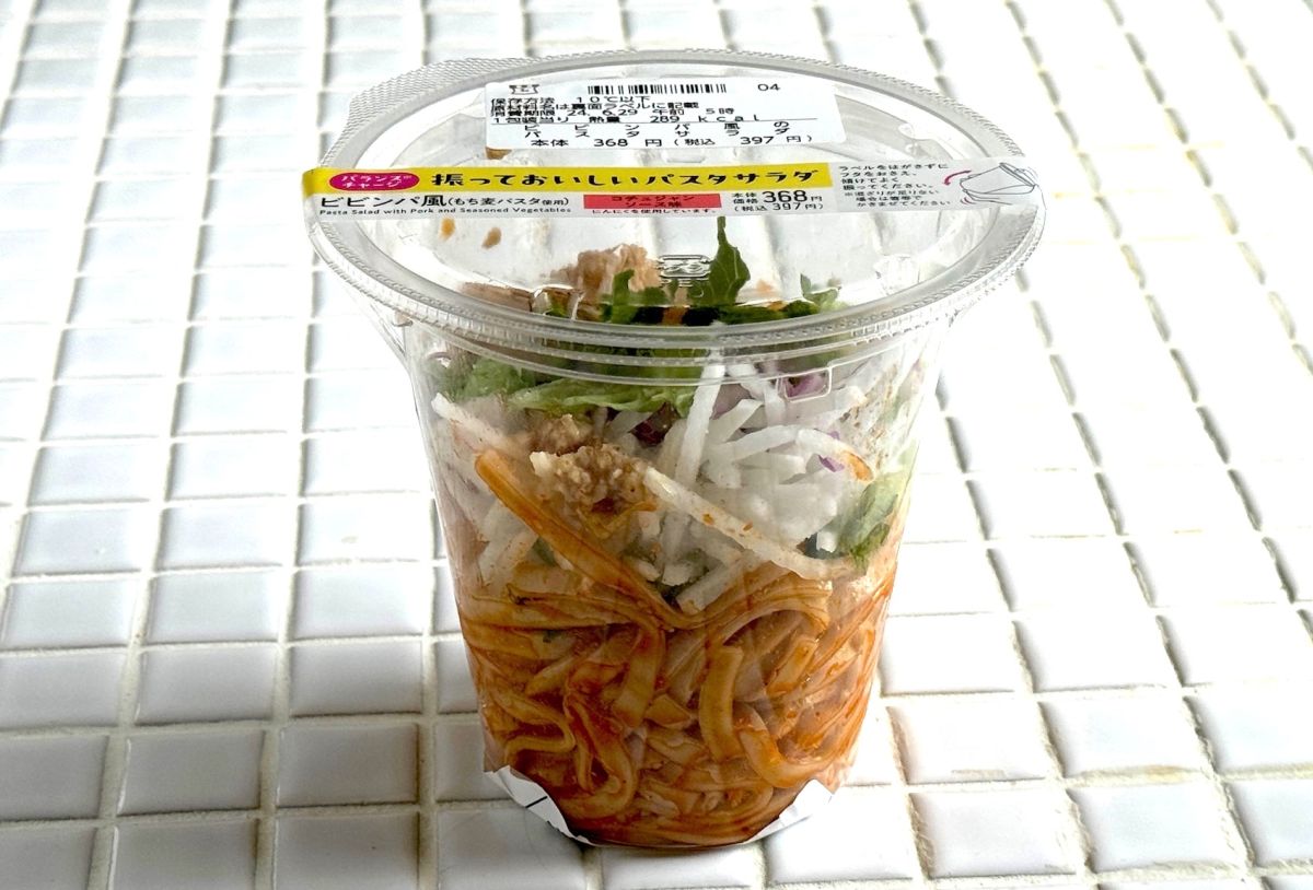 先の2つとは違って、平打ち麺が入った「振っておいしいパスタサラダ ビビンパ風」397円。