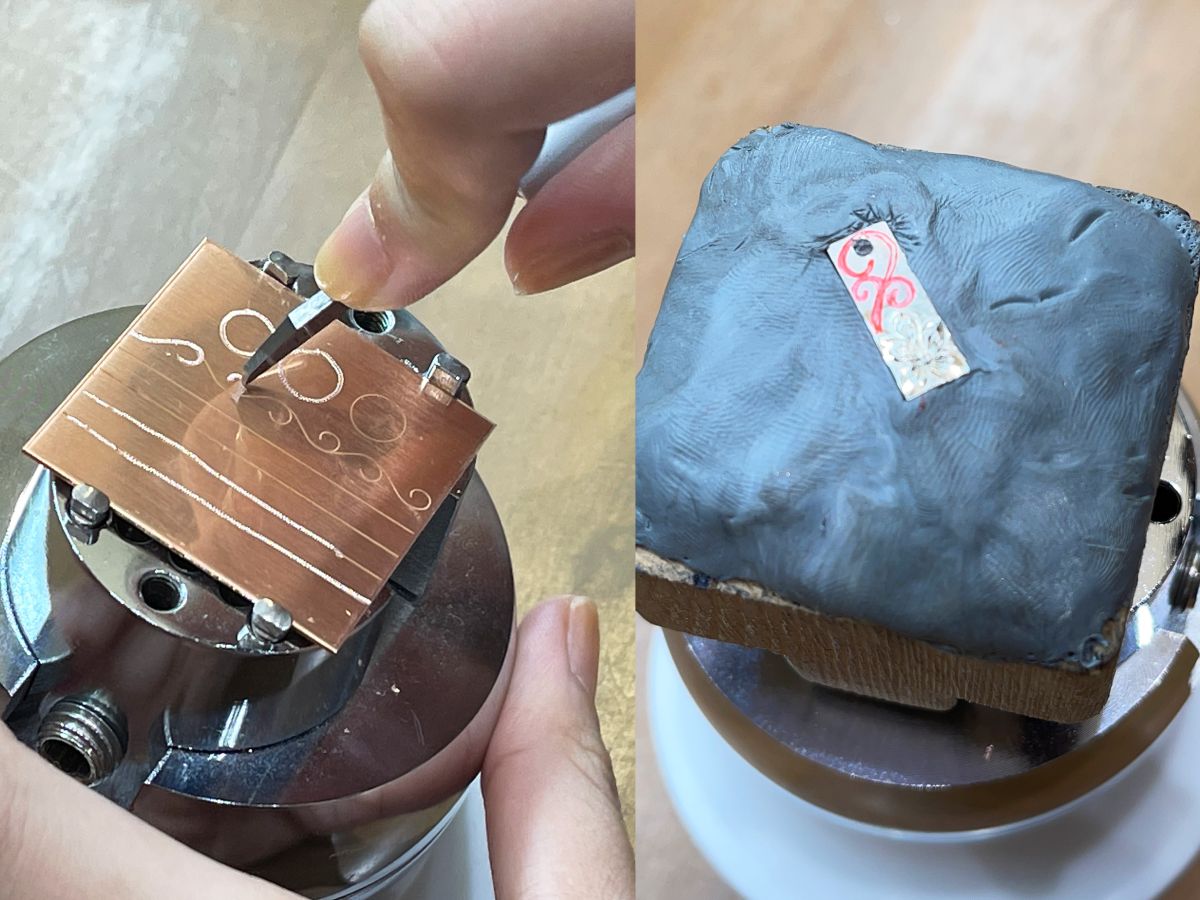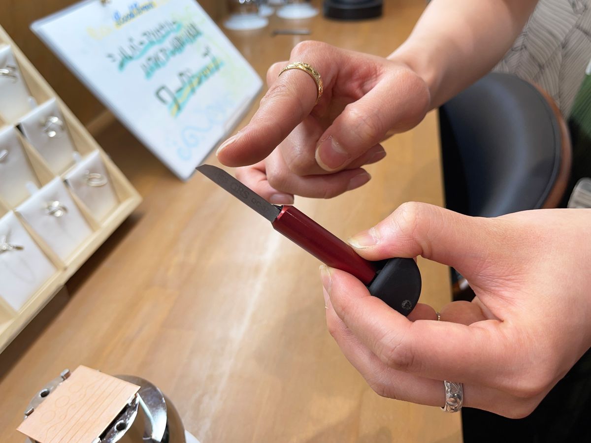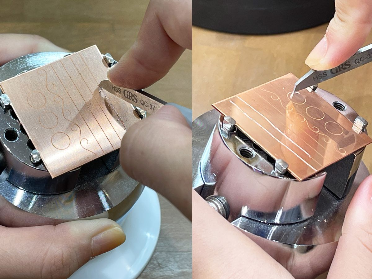 まずは直線の練習からスタート。スタッフからOKがもらえたら、円、模様の練習に進むことができます。しっかり練習してから本番のジュエリー彫りができるので、道具の使い方に不安がある人でも大丈夫!
